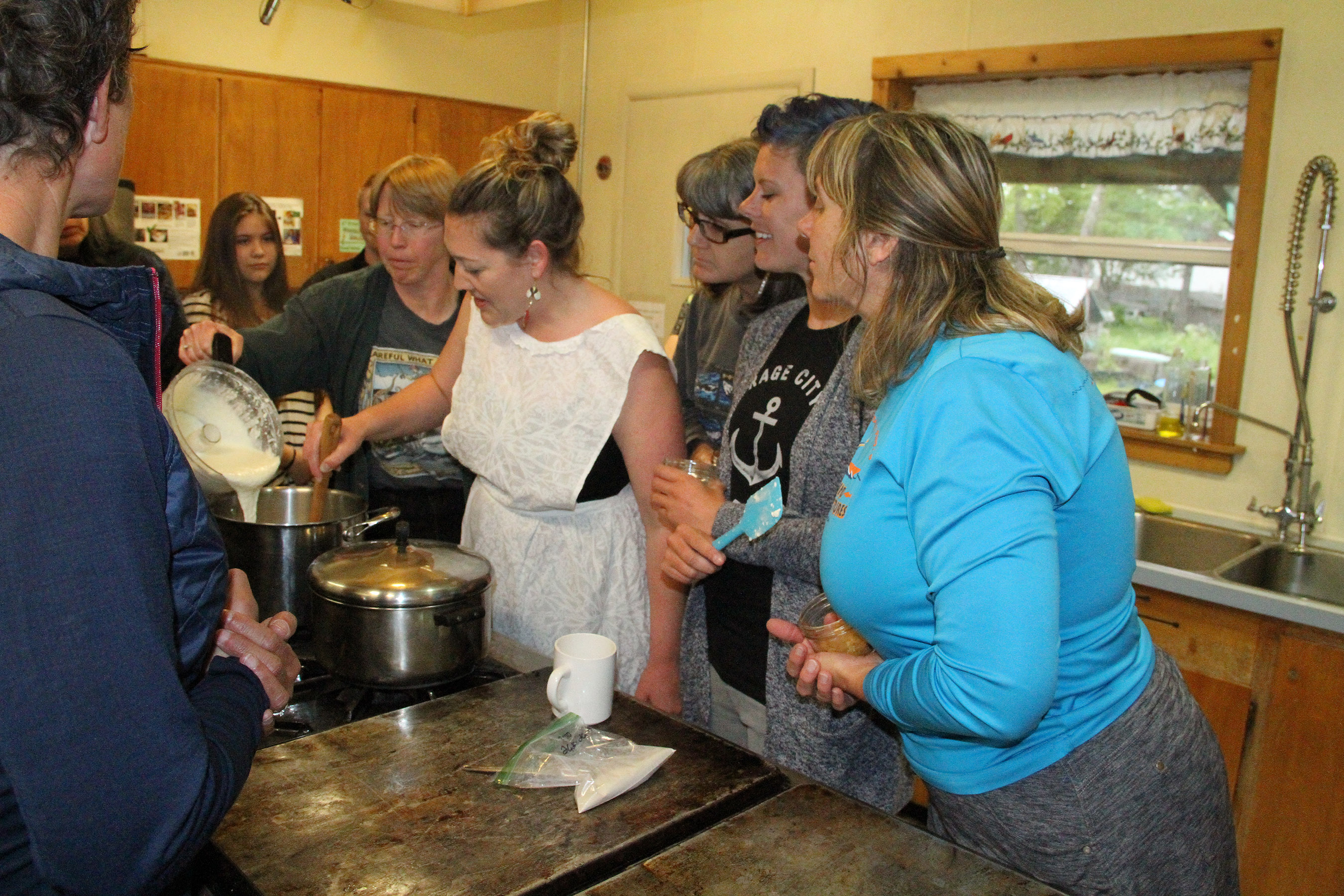 MichellePutzPoursMiniCheesecakeToppingAsAmeliaMosherStirsIntoPotOfWaterAndAgarAgar Published August 16, 2018 at 2700 × 1800 in Scenes from the Sitka Kitch cooking with seaweed class held in conjunction with the Sitka Mermaid Festival ← Previous Next →