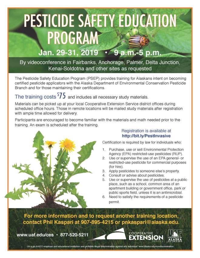 The University of Alaska Fairbanks Cooperative Extension Service will offer pesticide applicator certification training Jan. 29-31. The training will take place by videoconference in Fairbanks, Anchorage, Delta Junction, Palmer, Soldotna, Kodiak, Juneau, Sitka and other communities as requested. Classes will meet from 9 a.m. to 5 p.m., with an exam scheduled after the training.