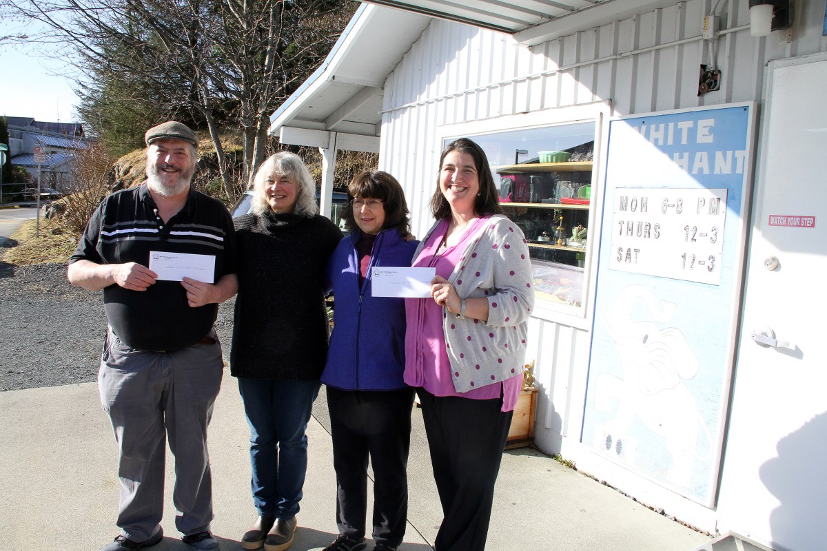 Charles Bingham of the Sitka Local Foods Network, left, and Donna Donohoe and Jessica Christianson of Friends of Sitka Circus Arts, right, pose with White Elephant Shop (White E) volunteer Cheryl Call, second from left, after receiving 2019 grant checks from the White E.