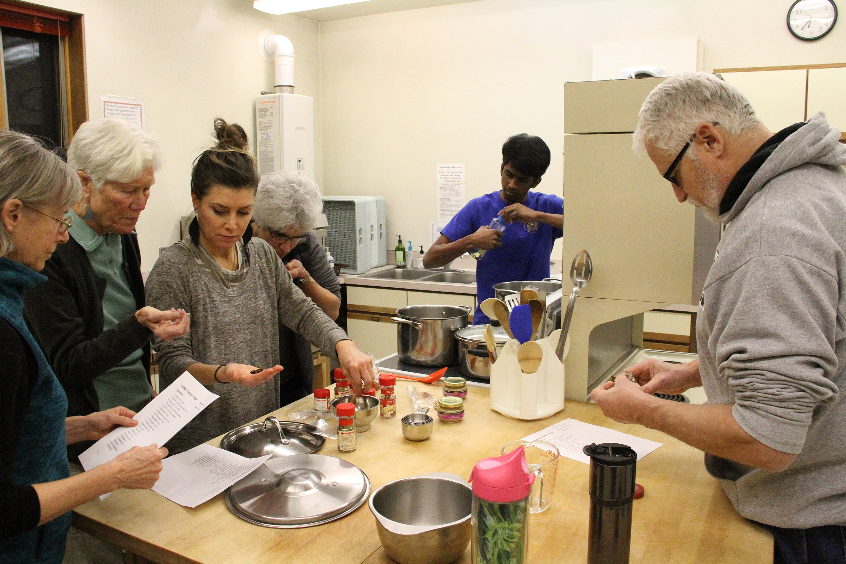 CleoGraceJenniferTobyAndTimMeasureSpicesWhileMohanAddsOilToPots Published February 21, 2019 at 2700 × 1800 in Scenes from the Sitka Kitch Indian cooking class with Mohan Arul ← Previous Next →