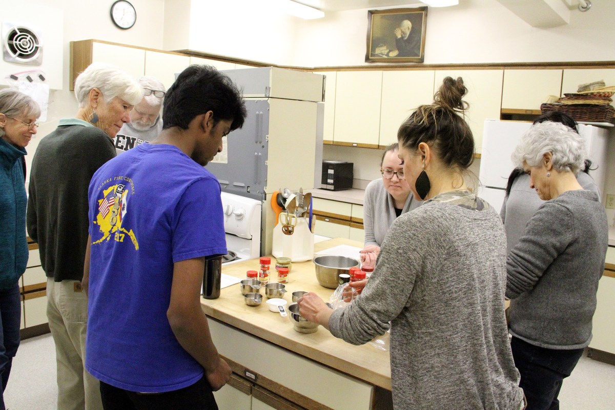 MohanAndStudentsCheckSpices Published February 21, 2019 at 2700 × 1800 in Scenes from the Sitka Kitch Indian cooking class with Mohan Arul ← Previous Next →