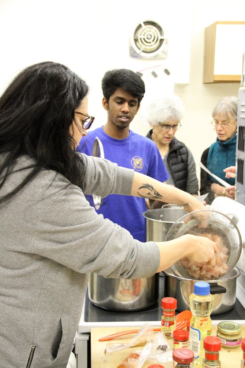 MohanWatchesHannahAddChickenToPot Published February 21, 2019 at 1800 × 2700 in Scenes from the Sitka Kitch Indian cooking class with Mohan Arul ← Previous Next →