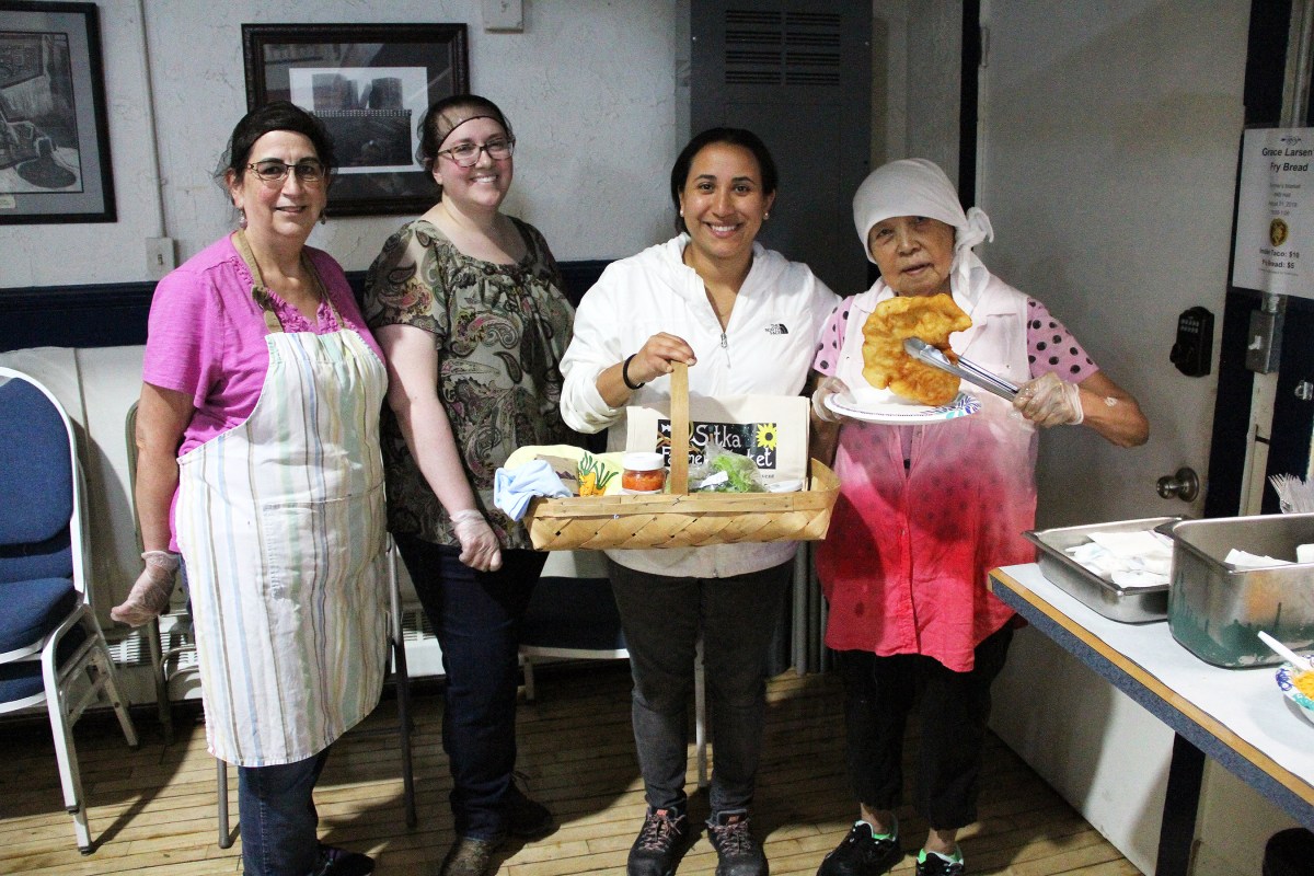 TABLE OF THE DAY: Sitka Farmers Market manager Nina Vizcarrondo, third from left, presents Nancy Furlaw, left, Rachel Henderson, second from left, and Grace Larsen, right, of the Alaska Native Sisterhood Camp No. 4 with the Table of the Day award during the fifth Sitka Farmers Market of the 2019 summer season, held Aug. 31, at the Alaska Native Brotherhood Founders Hall. ANS Camp No. 4 sold Grace’s frybread and Indian tacos. They received a certificate, a Sitka Farmers Market tote bag, two Sitka Local Foods Network t-shirts, some salad mix from St. Peter’s Fellowship Farm, some taster straws of Bridge Creek Birch Syrup, a Chugach Chocolate candy bar, a jar of Evie’s Brinery fermented food, and some Barnacle Foods kelp salsa. The Sitka Farmers Market recently was listed on the Exceptional Markets list by the Certified Naturally Grown program. The next Sitka Farmers Market is from 10 a.m. to 1 p.m. on Saturday, Sept. 7, at ANB Founders Hall (235 Katlian St.). The last market this summer is Sept. 21, plus there will be a Sitka Local Foods Network farm stand at the Running of the Boots event on Sept. 28. For more information, go to http://www.sitkalocalfoodsnetwork.org, or like our Sitka Local Foods Network page on Facebook, https://www.facebook.com/SitkaLocalFoodsNetwork, and our Sitka Farmers Market page on Facebook, https://www.facebook.com/SitkaFarmersMarket.
