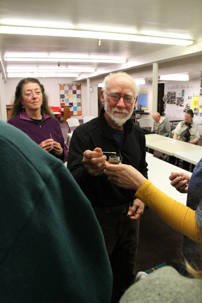 CharlieDipsToothpickIntoHoneyJarAsBrendaWaits Published September 22, 2019 at 1800 × 2700 in Scenes from the Sitka Kitch’s class, ‘Bees, Pollinators, and Honey, Oh, My!’ ← Previous Next →