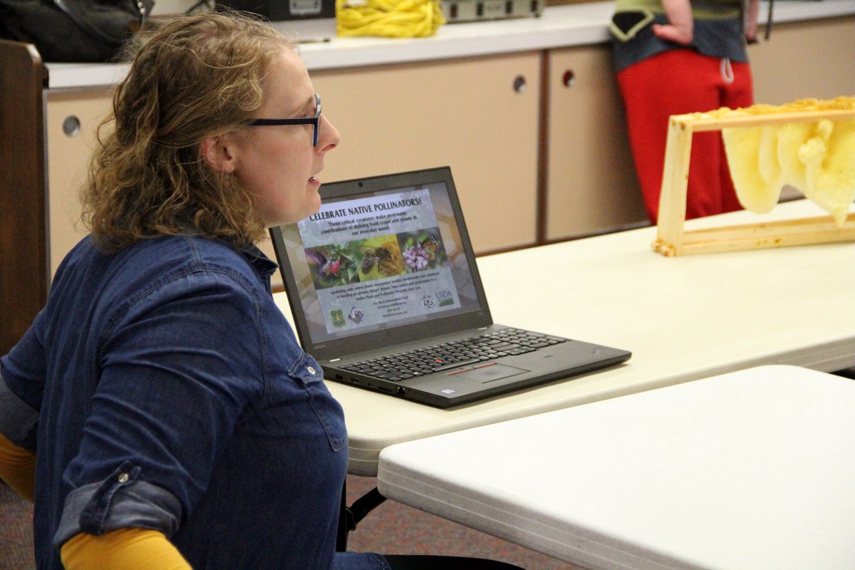 ChristiWithPowerPointOnComputer Published September 22, 2019 at 2700 × 1800 in Scenes from the Sitka Kitch’s class, ‘Bees, Pollinators, and Honey, Oh, My!’ ← Previous Next →