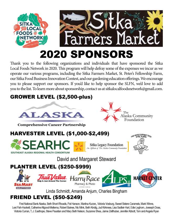 The Sitka Local Foods Network in recent years created a sponsorship program to help promote our mission, and Sitka businesses and individuals are welcome to join for 2020. The goal of the sponsorship program is to make the projects we undertake (Sitka Farmers Market, St. Peter’s Fellowship Farm, gardening education, etc.) more sustainable.