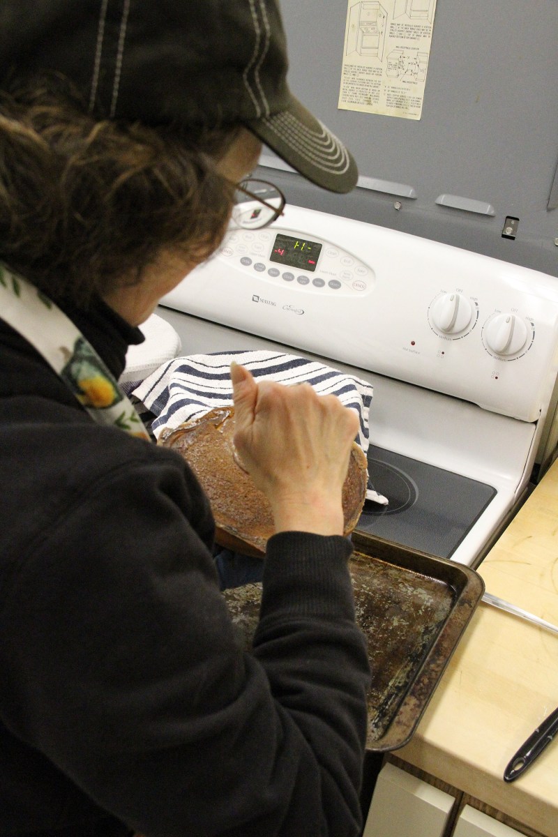 RobinTapsBottomOfSpiralChallahToCheckDoneness Published February 23, 2020 at 1800 × 2700 in Scenes from the Sitka Kitch’s Winter Baking Series class Challah With Robin Sherman ← Previous Next →