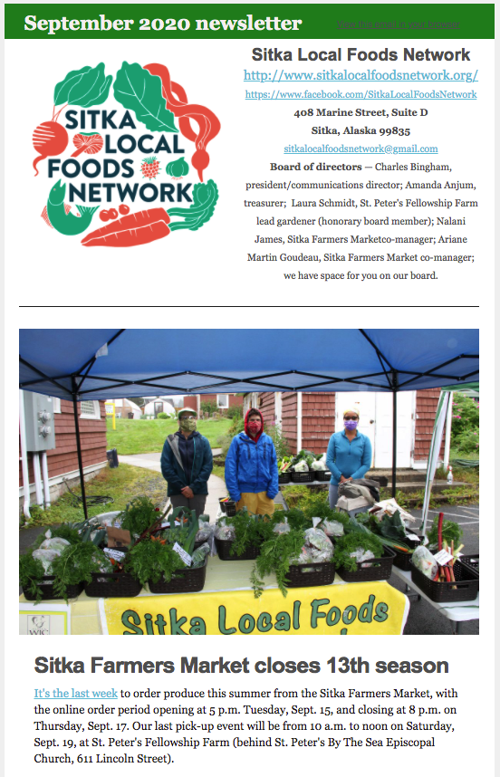 This year the last Sitka Farmers Market order period was Sept. 15-17 and last pick-up day was Sept. 19. Due to COVID-19, the 26th annual Running of the Boots fun run fundraiser won’t take place in late September (we usually had a farm stand at that event, which raised money for the Sitka Local Foods Network and Youth Advocates of Sitka last year).