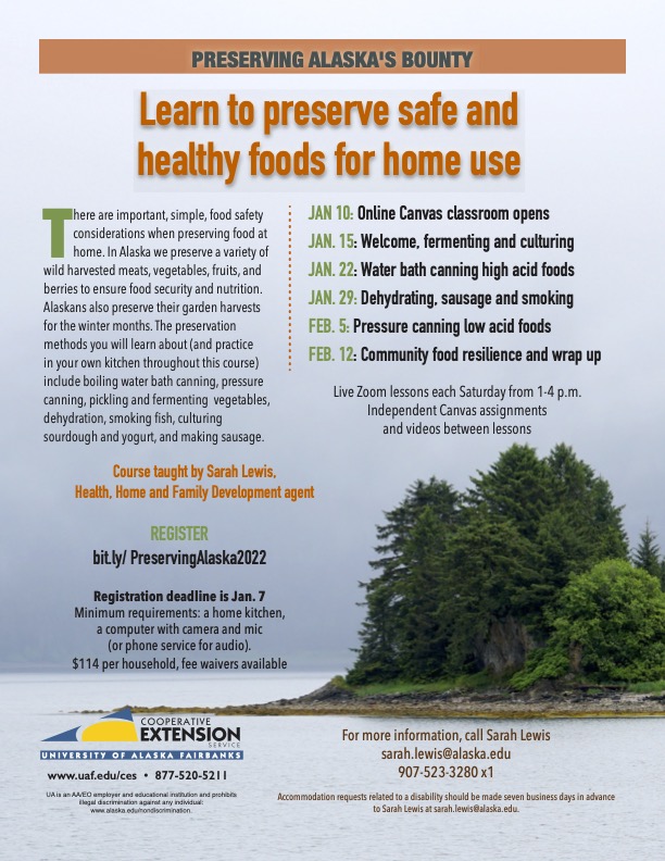 The registration deadline is 11:30 p.m. on Friday, Dec. 17. Space is limited, so register early to secure your place in the class. You can register and pre-pay using credit/debit cards or PayPal on the Sitka Kitch EventSmart online registration page, http://sitkakitch.eventsmart.com (click on class title). For those wanting to pre-pay with cash or check, please call Chandler O’Connell or Kylee Jones at Sitka Conservation Society (747-7509) to arrange a payment.