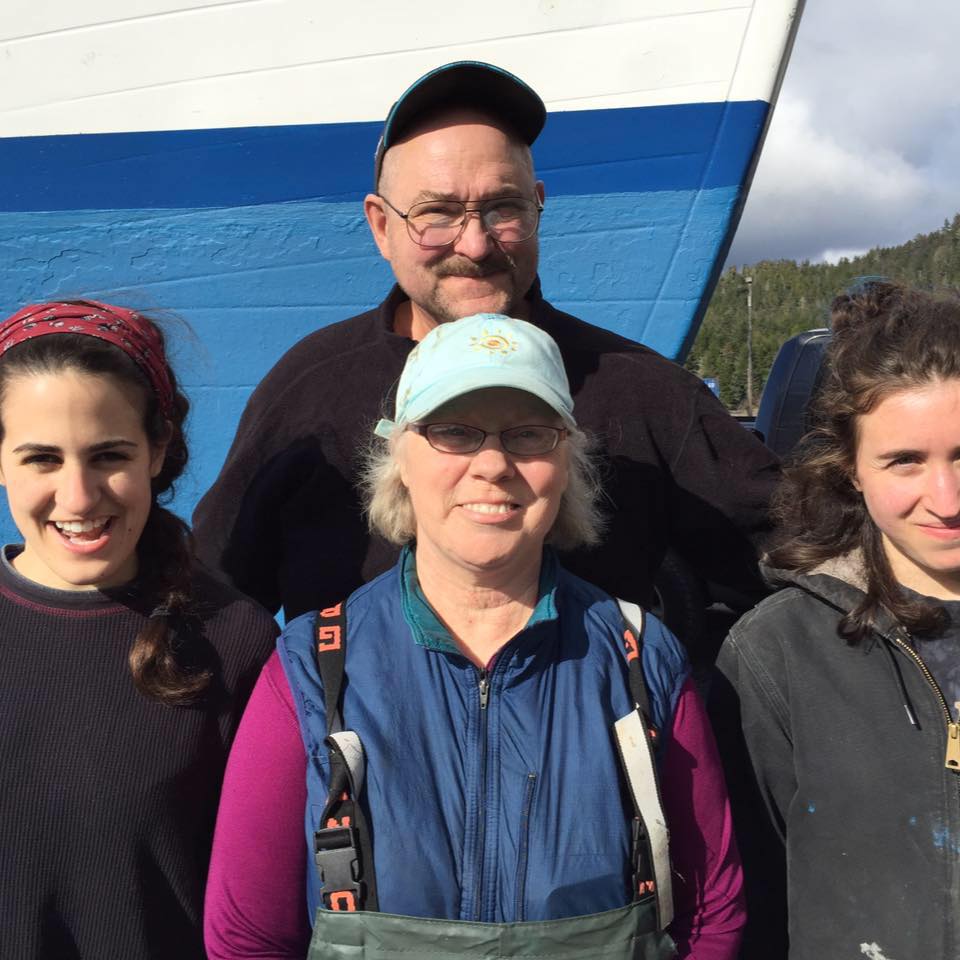 Eric Jordan of Sitka, back center, poses with crew members (l-r) Alyssa Russell, Sarah Jordan (his wife) and Anya Grenier on his troller, the F/V I Gotta. Eric has hosted more than 40 young apprentices on his boat in recent years.