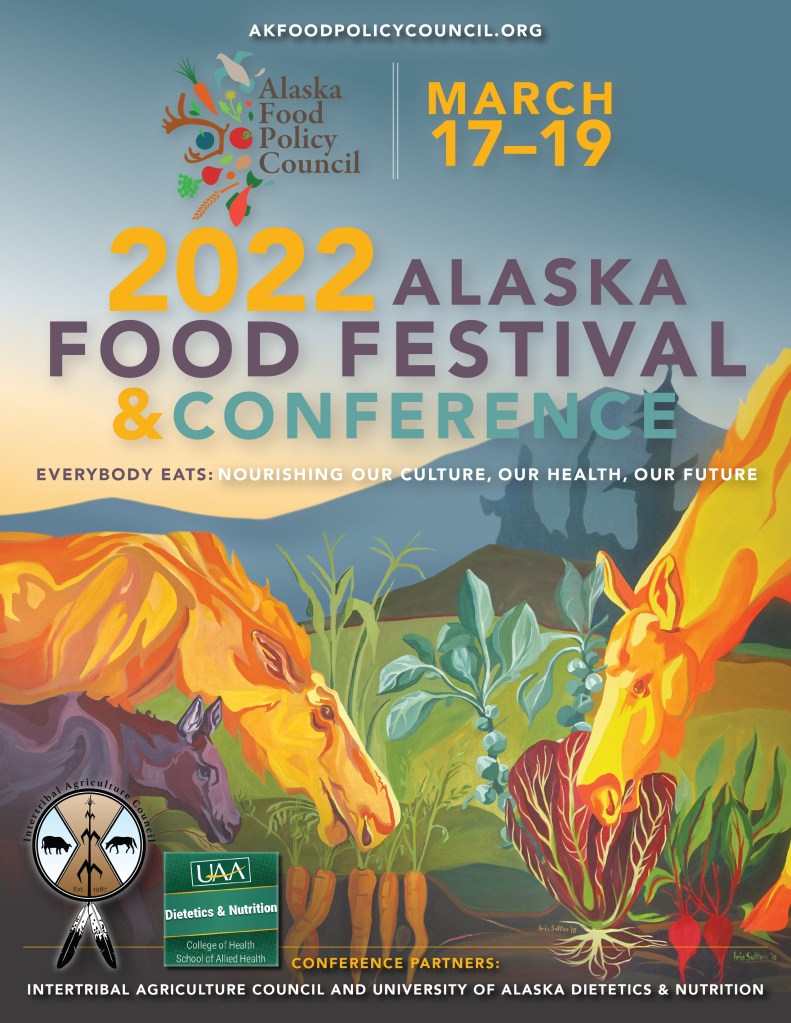 Registration is open for the 2022 Alaska Food Festival and Conference, which is going virtual on Friday and Saturday, March 18-19, this year due to the COVID-19 pandemic. It opens with a pre-conference movie on Thursday, March 17. This year’s theme is “Everybody Eats: Nourishing Our Culture, Our Health, Our Future.”