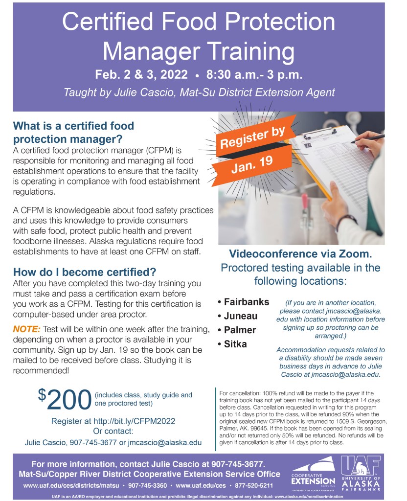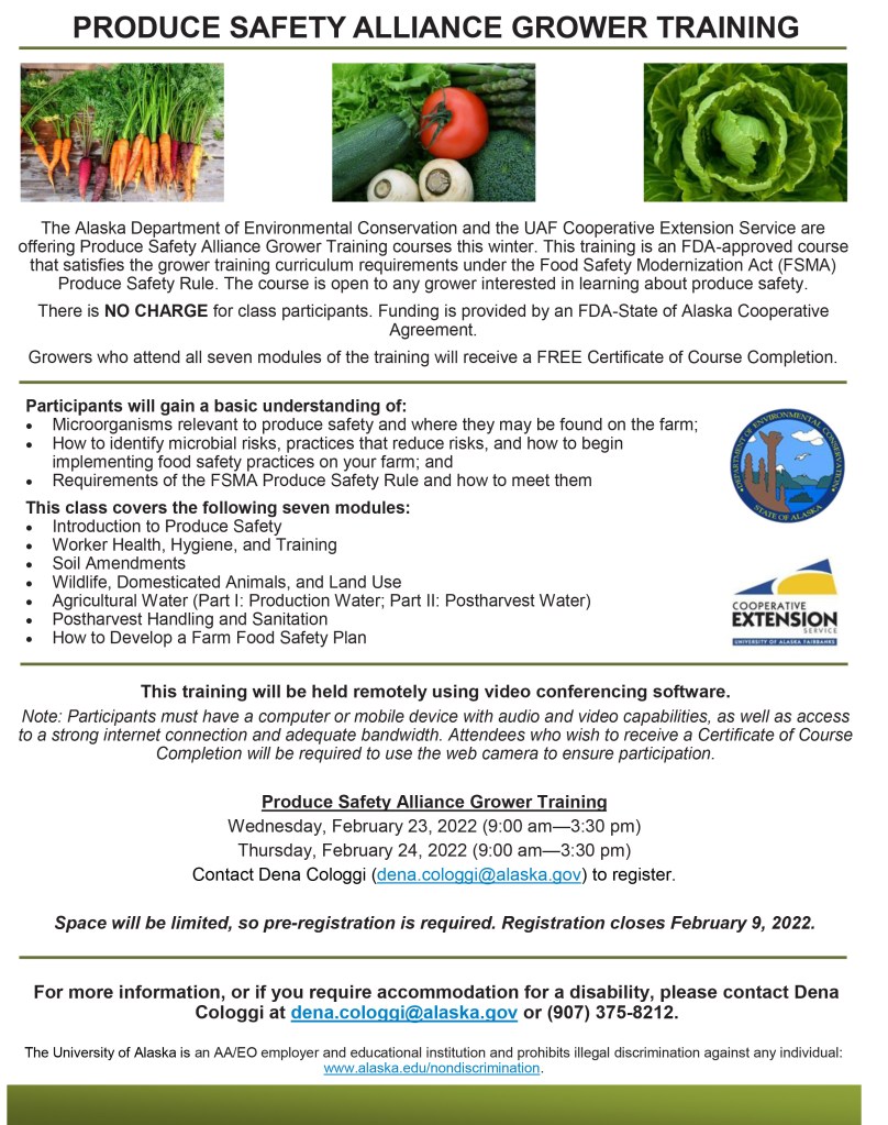 This Food and Drug Administration (FDA)-approved course will satisfy the grower training curriculum requirements under the FDA’s Food Safety Modernization Act Produce Safety Rule. There is no charge for class participants. Funding is provided by a FDA-State of Alaska Cooperative Agreement. Growers who attend all seven modules of the course will receive a FREE Certificate of Course Completion. The workshop is open to all interested growers. Please see the attached flyer for more information. Space will be limited, so pre-registration is required. Contact Dena at dena.cologgi@alaska.gov to register.