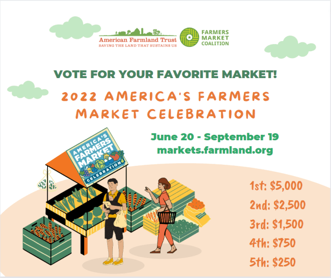 The voting period for the 14th annual America’s Farmers Market Celebration is open and people can go online and support their favorite farmers markets through Sept. 19. After being sponsored under various names by the American Farmland Trust during its early years, this year the Trust is teaming up with the Farmers Market Coalition to host the contest.