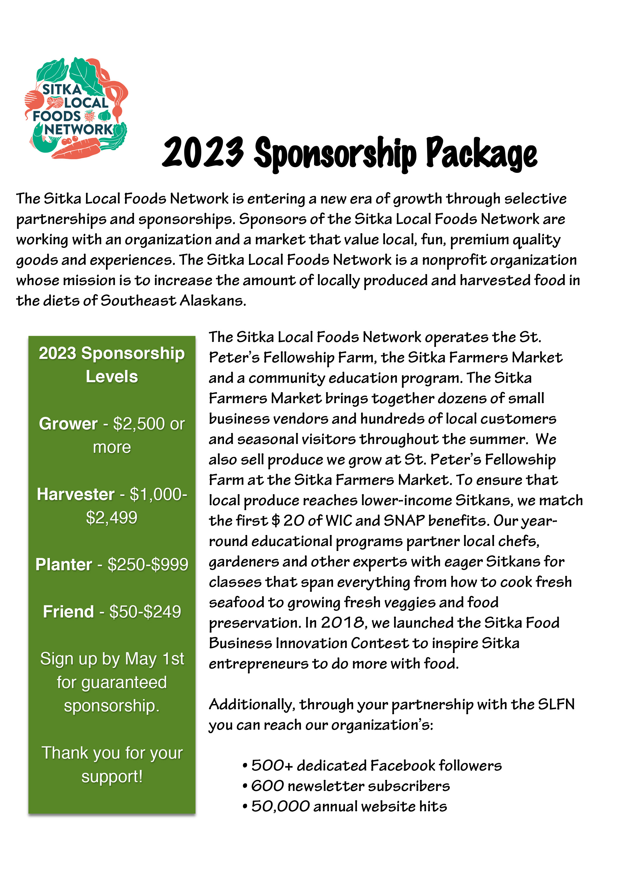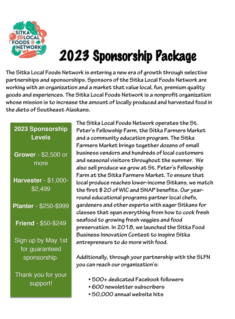 The Sitka Local Foods Network in recent years created a sponsorship program to help promote our mission, and Sitka businesses and individuals are welcome to join for 2023. The goal of the sponsorship program is to make the projects we undertake (Sitka Farmers Market, St. Peter’s Fellowship Farm, gardening education, food business development, etc.) more sustainable.