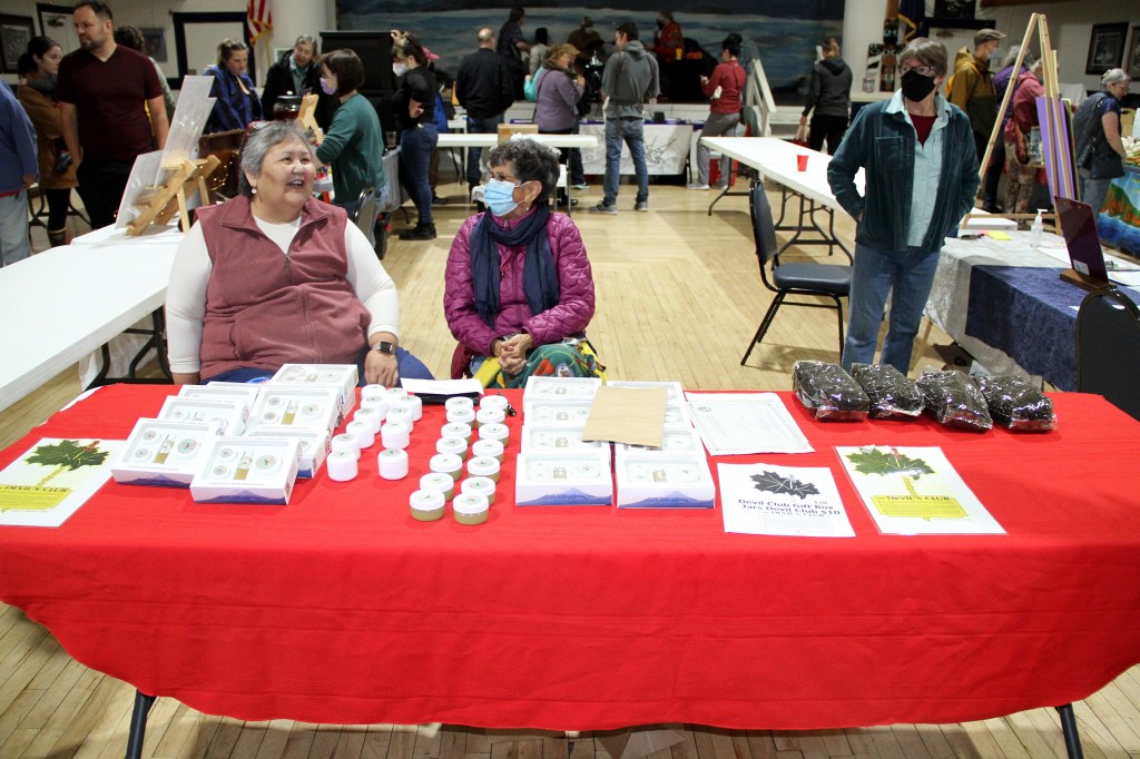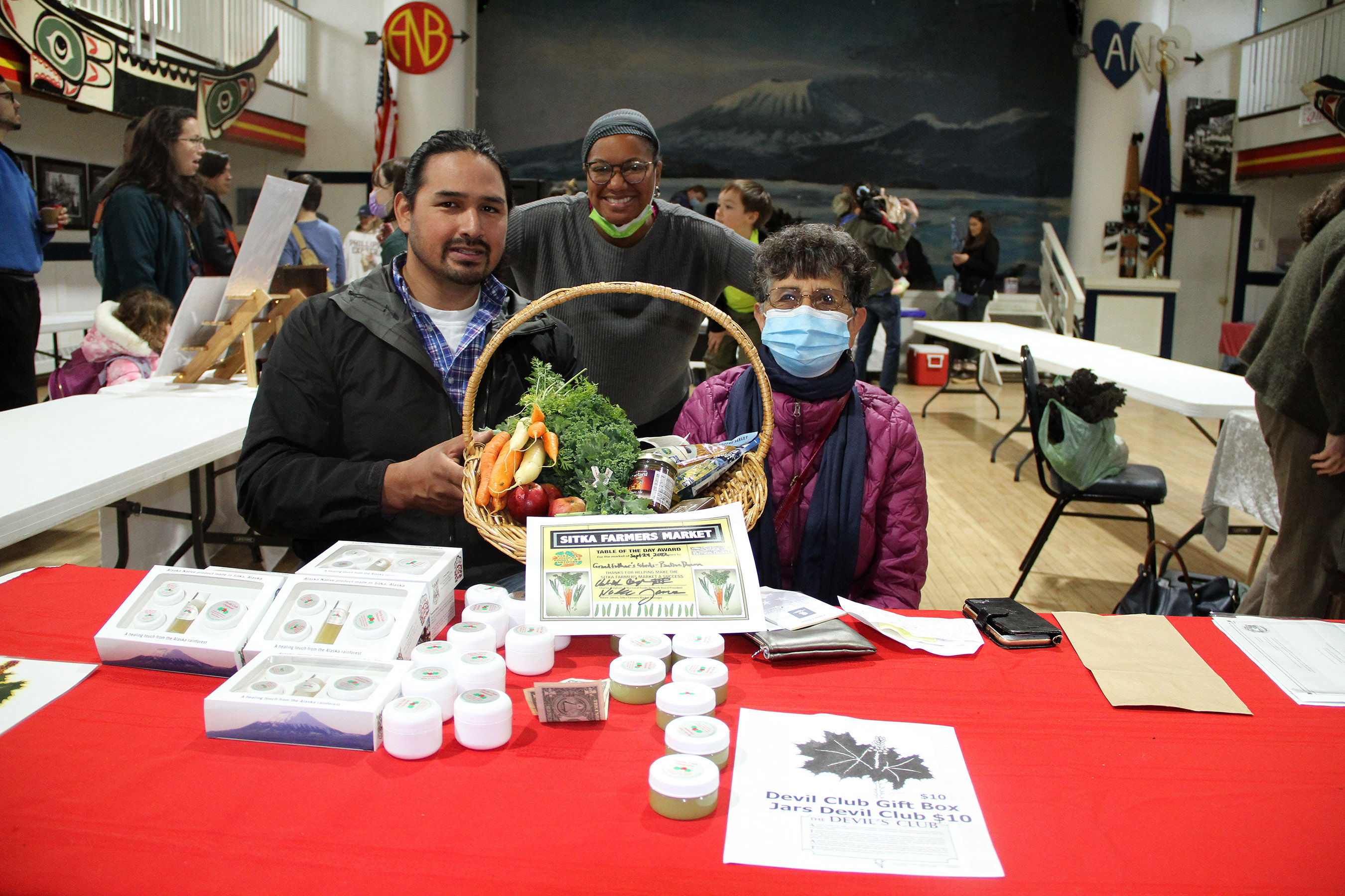 Sitka Farmers Market volunteer Derek James, and Sitka Farmers Market manager Nalani James, center, present the Table of the Day Award for Sept. 24 to Pauline Duncan of Grandfather’s Words. Pauline sold a variety of locally devil’s club salves and gift baskets, and more. She received a certificate, two Sitka Farmers Market special label chocolate bars, a bunch of carrots, some apples, a bunch of kale, Foraged & Found kelp salsa, a package of Alaska Flour Company barley pancake mix, a package of Alaska Flour Company couscous, a jar of Moosetard mustard, and other prizes. This was the last Sitka Farmers Market of the summer, and our next market will probably be in late June or early July 2023. More details about the Sitka Local Foods Network and Sitka Farmers Market can be found at http://www.sitkalocalfoodsnetwork.org.