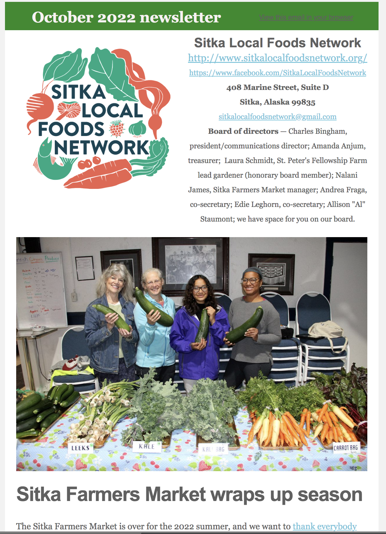 The Sitka Local Foods Network just sent out the October 2022 edition of its monthly newsletter. Feel free to click this link to get a copy.