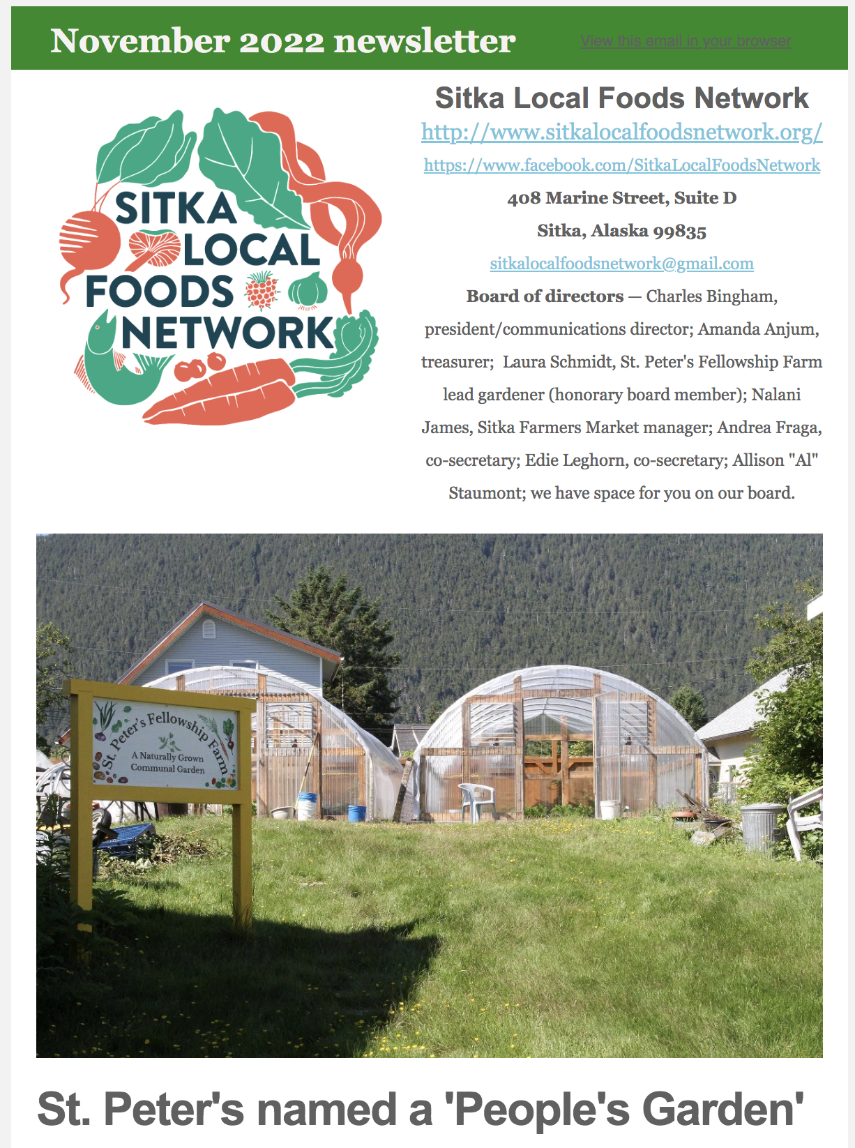 The Sitka Local Foods Network just sent out the November 2022 edition of its monthly newsletter. Feel free to click this link to get a copy.