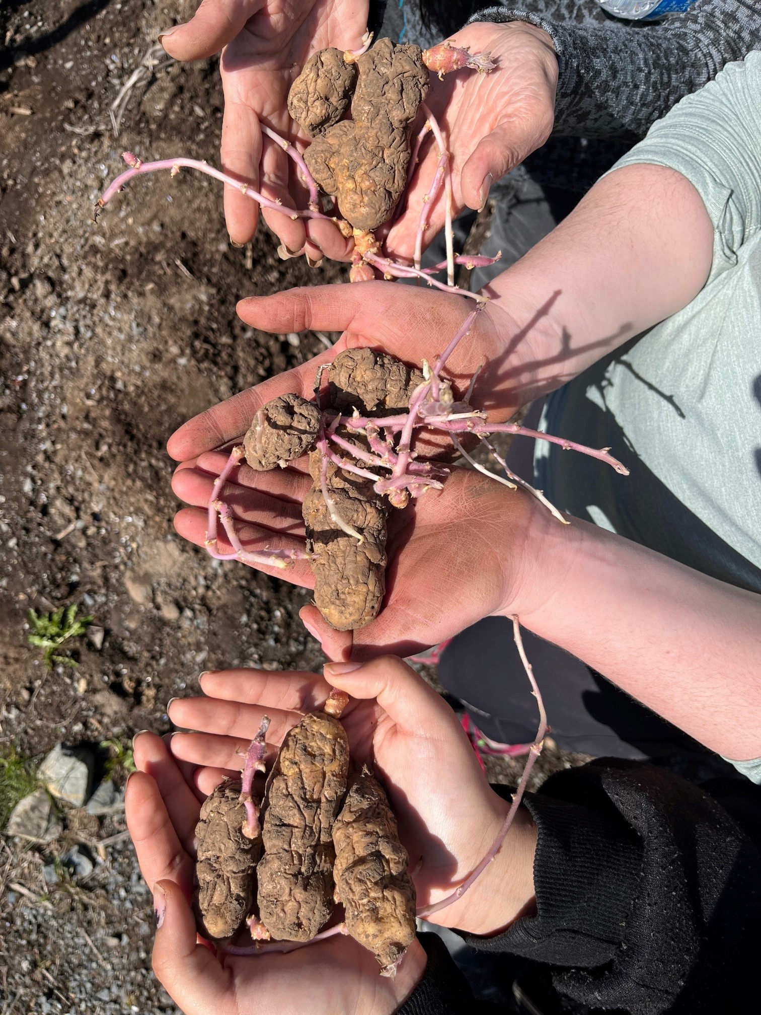 SITKA, Alaska, April 26, 2023 — The Sitka Tribe of Alaska (STA), Pacific High School, and Tongass National Forest joined forces last week for the sixth consecutive year to plant Tlingít (also called Maria’s) potatoes. Several STA staff and elders led the 10 school volunteers and 11 Forest Service staff in the planting process, then shared the potato’s history and some stories.
