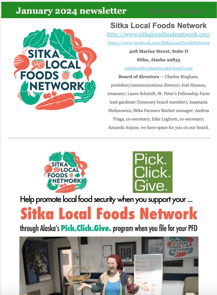 The Sitka Local Foods Network just sent out the January 2024 edition of its monthly newsletter. Feel free to click this link to get a copy.