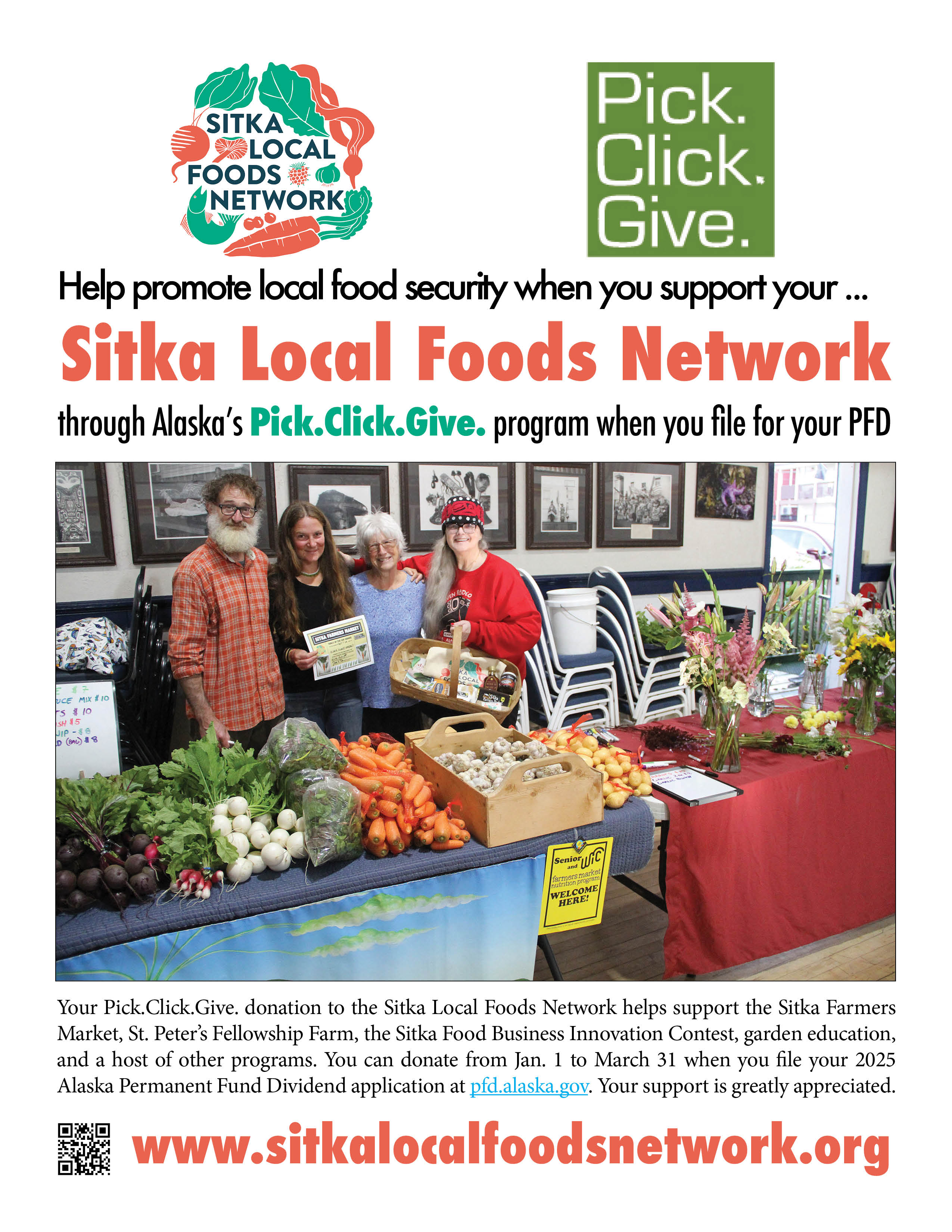 For the past several years, the Sitka Local Foods Network has participated in the Pick.Click.Give. program, which allows people to donate in $25 increments to their favorite statewide and local 501(c)(3) nonprofit organizations when they file their PFD applications from Jan. 1 through March 31.