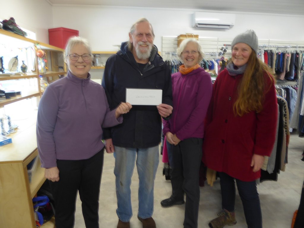 WHITE E GRANTS – White Elephant Shop volunteer Sarah Jordan, left, presents a grant award of $2,000 to representatives of the Sitka Local Food Network, President Joel Hanson, Laura Schmidt and Andrea Fraga. ‘‘This year, thanks to quality donations and dedicated shoppers, we are able to give $145,000 back to the community,’’ the White Elephant said. (Photo provided to the Sentinel)