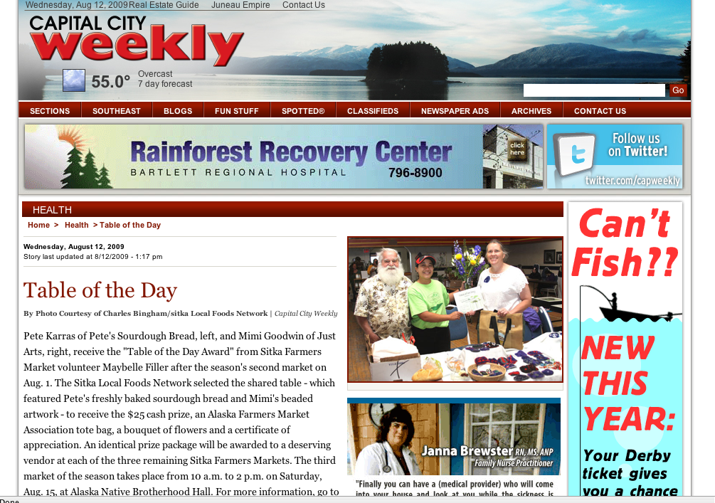 Capital City Weekly screenshot showing the Table of the Day Award winners from the second Sitka Farmers Market of the summer (Aug. 1)