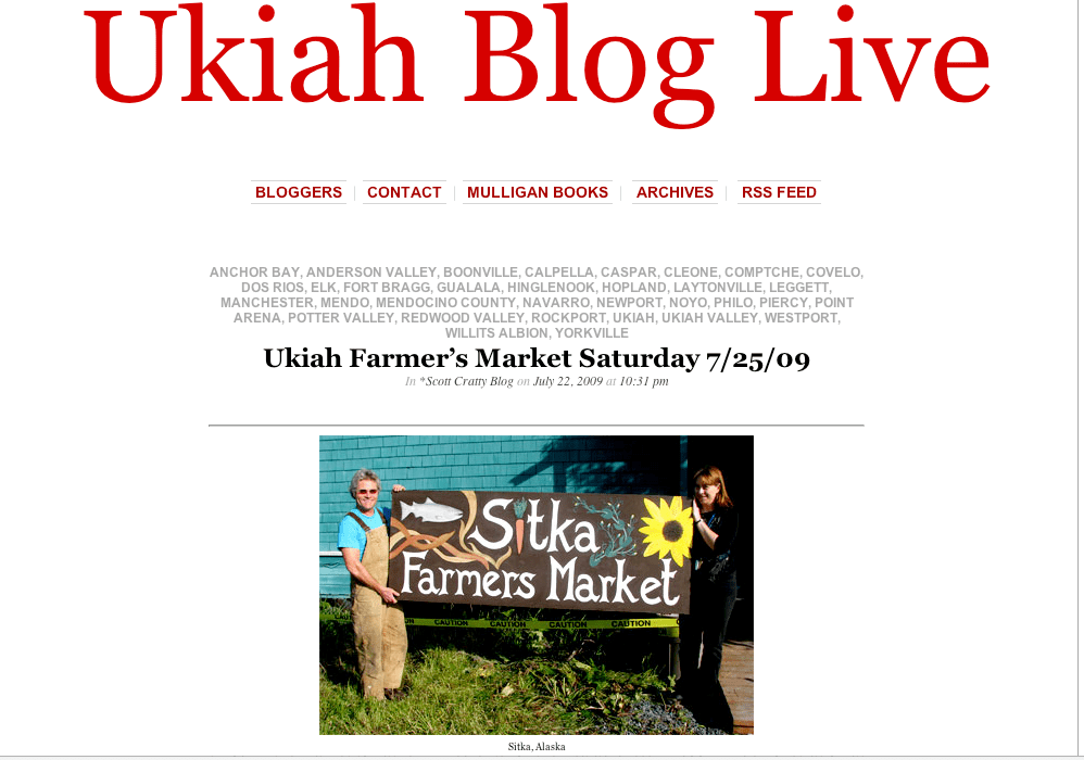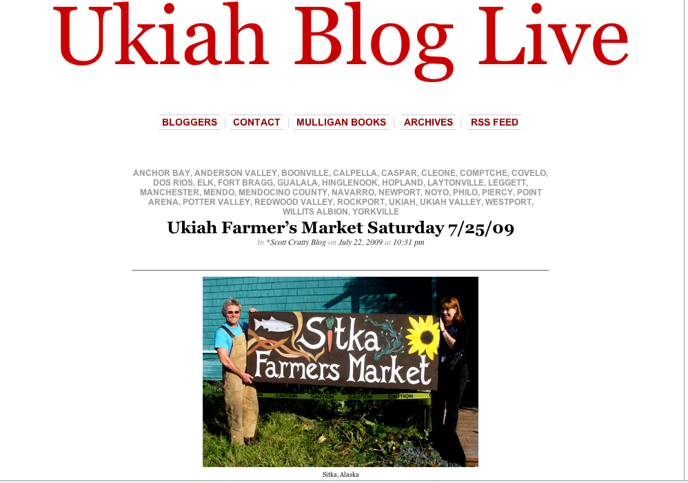 Picture 3 Published August 21, 2009 at 998 × 700 in ← Previous Next → Screenshot of the Ukiah Blog Live site with a photo of Kerry MacLane and Linda Wilson holding the Sitka Farmers Market sign Screenshot of the Ukiah Blog Live site with a photo of Kerry MacLane and Linda Wilson holding the Sitka Farmers Market sign