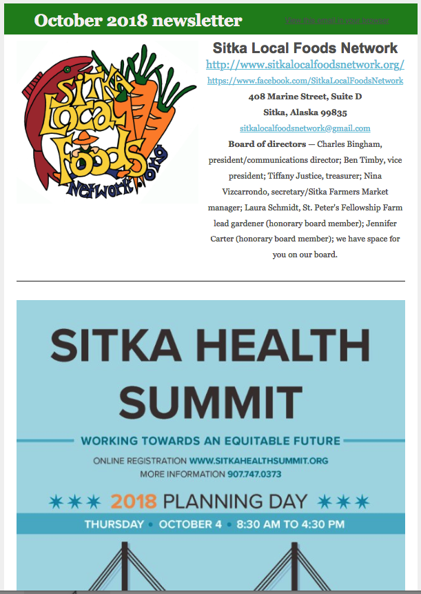 The Sitka Local Foods Network just sent out the October 2018 edition of its monthly newsletter. Feel free to click this link to get a copy.