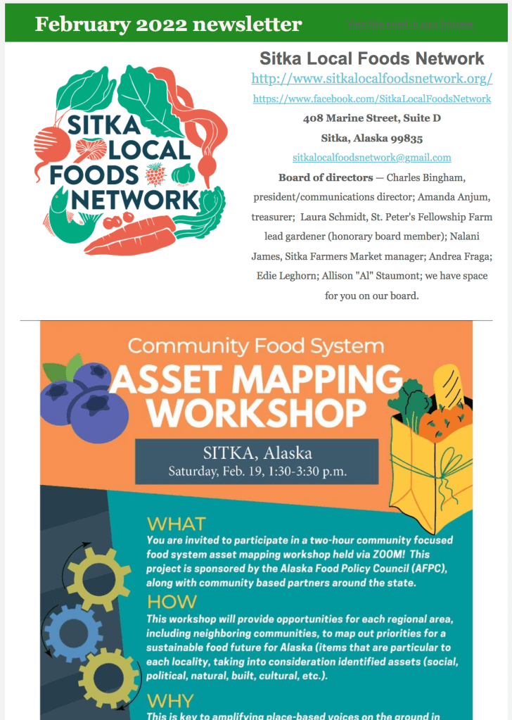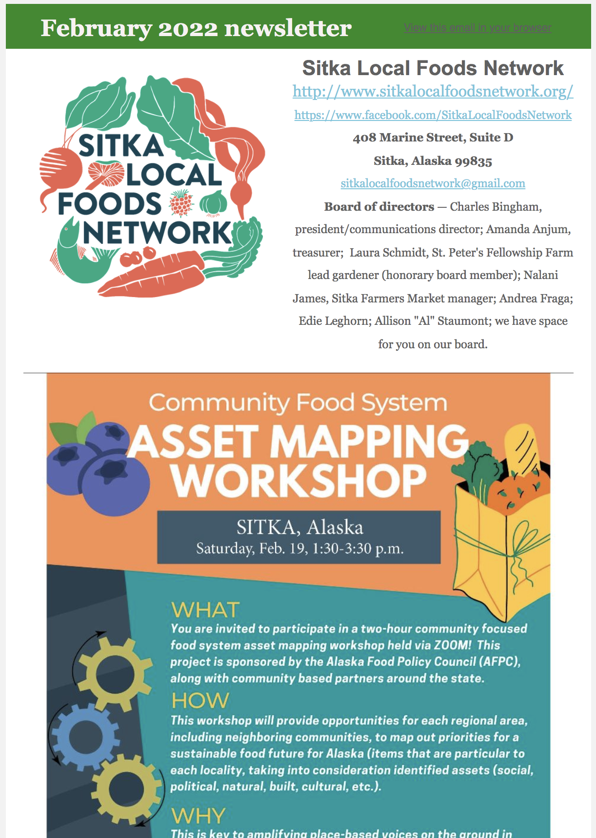 The Sitka Local Foods Network just sent out the February 2022 edition of its monthly newsletter. Feel free to click this link to get a copy.