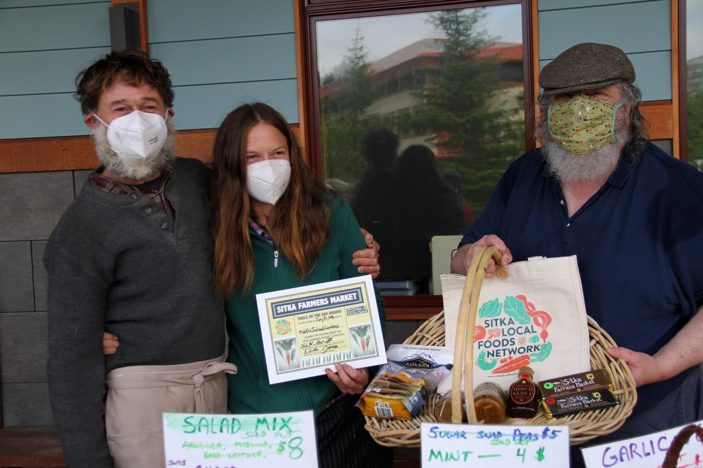 Sitka Farmers Market volunteers Daniel Asanji (exchange student from Cameroon), left; Sadija Masic (Bosnia-Herzegovina), third from left; Imane Baghouri (Morocco), second from right; and Trish White, right, present the Table of the Day Award for Aug. 13 to Andrea Fraga of Middle Island Gardens. That was the last day of National Farmers Market Week. Andrea sold a variety of fresh produce, including lettuce, kale, zucchini, carrots, turnips, beets, garlic, and more. She received a Sitka Local Foods Network tote bag, two Sitka Farmers Market special label chocolate bars, Moosetard Lead Dog BBQ sauce, Foraged & Found kelp salsa, Alaska Flour Company barley couscous, and other prizes. The next Sitka Farmers Market is scheduled for 10 a.m. to 1 p.m. on Saturday, Aug. 27, at the Alaska Native Brotherhood Founders Hall (235 Katlian Street). The last markets of the season are on Sept. 10 and Sept. 24. We still have room for vendors, and vendors can register online (by Thursday morning on market week) at https://sitkafarmersmarket.eventsmart.com. More details about the Sitka Local Foods Network and Sitka Farmers Market can be found at http://www.sitkalocalfoodsnetwork.org.