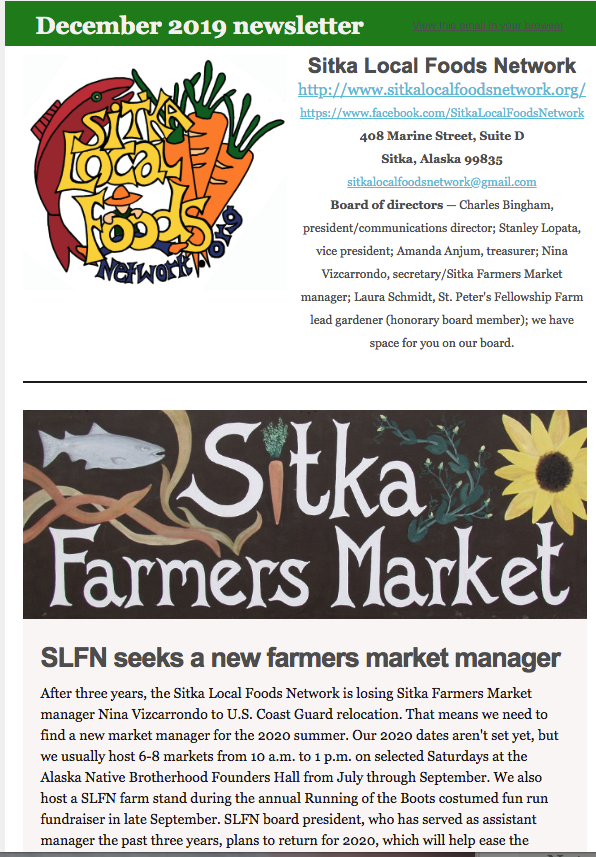 Happy holidays. The Sitka Local Foods Network just sent out the December 2019 edition of its monthly newsletter. Feel free to click this link to get a copy.