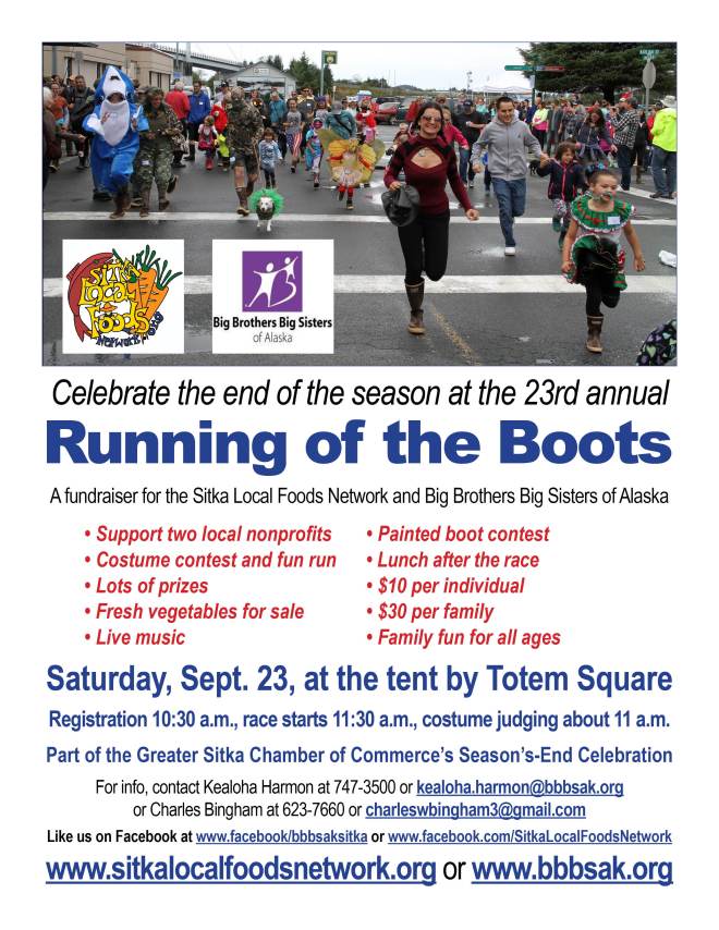 To learn more about the Running of the Boots, contact Kealoha Harmon of Big Brothers Big Sisters of Alaska at 747-3500 or by email at kealoha.harmon@bbbsak.org, or Charles Bingham of the Sitka Local Foods Network at 623-7660 or by email at charleswbingham3@gmail.com. We also need several volunteers to help set up and take down the race (two needed) and to judge the costumes (two needed). Contact Kealoha to learn how to volunteer.