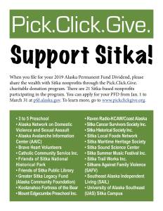 In 2019 Alaskans contributed $2.9 million to 627 Alaska nonprofit organizations, and more than $24.0 million has been donated since the program started in 2009. Some Alaskans choose to donate to just one group, while others may spread several donations around to many groups. There now are  622 total 501(c)(3) nonprofit organizations participating in Pick.Click.Give. for 2020 (including multi-location nonprofits), including 20 from Sitka. In 2019, Alaskans donated $39,800 to Sitka-based nonprofits, up from $33,925 in 2018.
