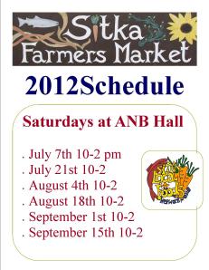 Aug. 18 will be the fourth of six full Sitka Farmers Markets this summer, with the schedule running on alternate Saturdays (July 7, 21, Aug. 4, 18, Sept. 1 and 15). The markets feature local seafood (fresh, frozen, and cooked, ready to eat), locally grown and harvested fruits and vegetables, baked bread, locally picked berries, jams and jellies, cooking demonstrations, live entertainment, locally brewed and roasted coffee, music, local arts and crafts, and a variety of other items gathered or made in Sitka. We emphasize local products and lots of fun. We are the first farmers market in Southeast Alaska to accept WIC coupons. You also can vote for the Sitka Farmers Market in the America’s Favorite Farmers Markets contest by following the links at https://sitkalocalfoodsnetwork.org/2012/06/22/%E2%80%A2-dont-forget-to-vote-for-the-sitka-farmers-market-in-this-years-americas-favorite-farmers-markets-contest/.
