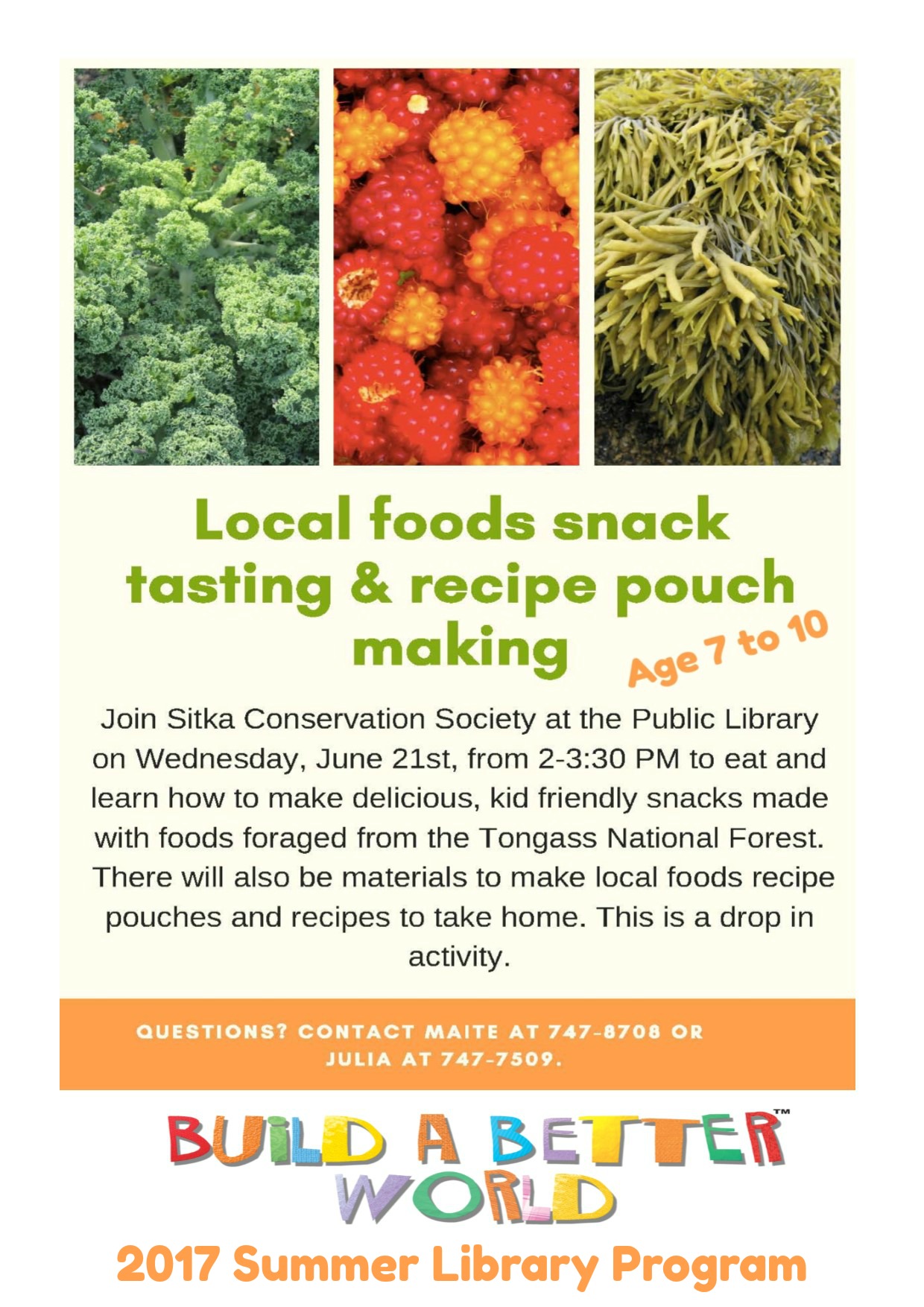 The Sitka Conservation Society will host a local foods tasting and recipe pouch making event for kids ages 7-10 from 2-3:30 p.m. on Wednesday, June 21, at the Sitka Public Library.
