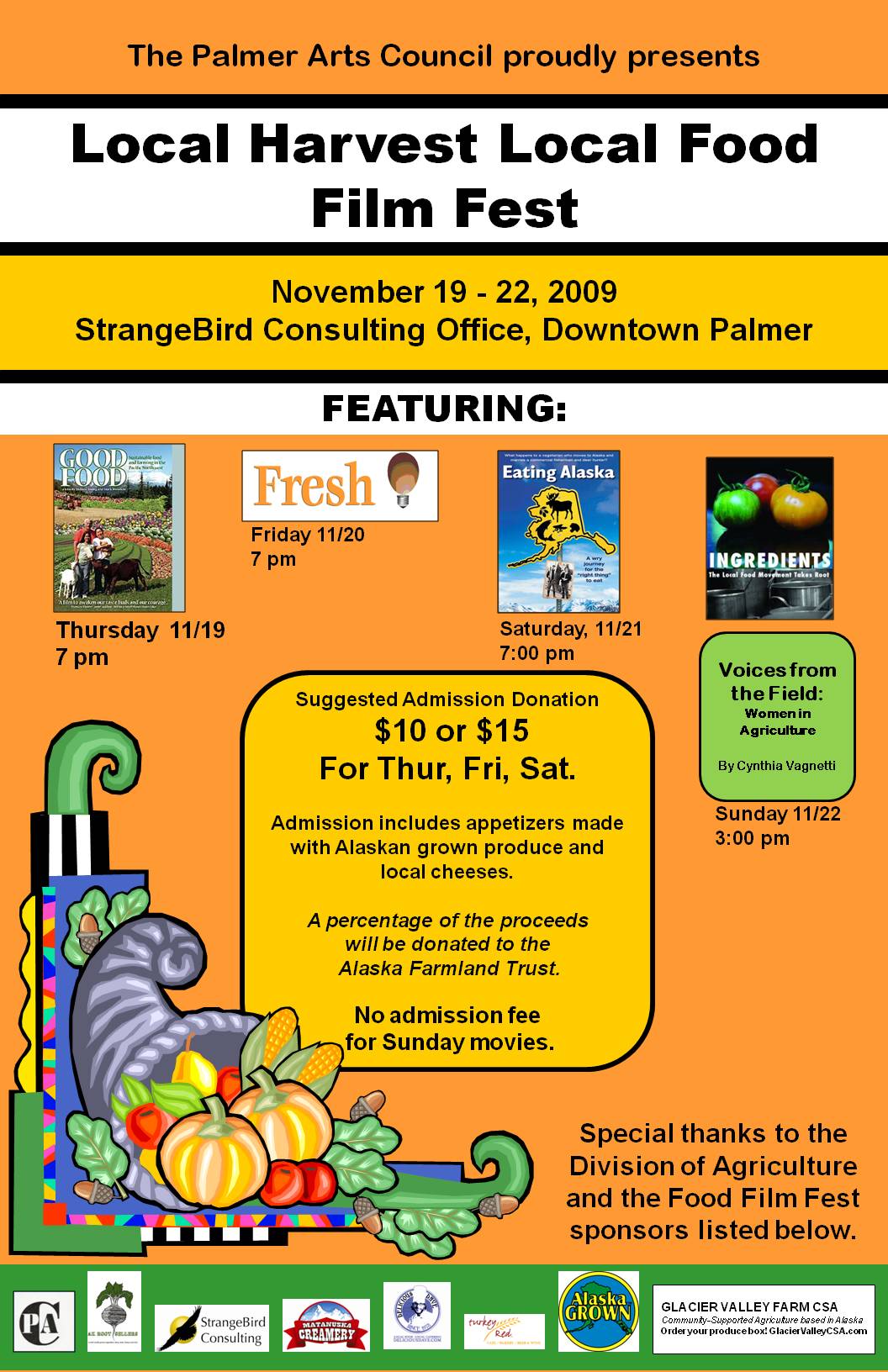 Join the Palmer Arts Council for its inaugural “Local Harvest, Local Food” film fest from Thursday, Nov. 19, through Sunday, Nov. 22, at the Strangebird Consulting Office in downtown Palmer. “Good Food” screens at 7 p.m. on Thursday, Nov. 19; “Fresh” shows at 7 p.m. on Friday, Nov. 20; “Eating Alaska” by Sitka filmmaker Ellen Frankenstein screens at 7 p.m. on Saturday, Nov. 21; and “Ingredients” shows at 3 p.m. on Sunday, Nov. 22. After the Sunday showing there will be a discussion about women in agriculture with Cynthia Vignetti. Suggested donations are $10-15 for all films except for Sunday, which is free.
