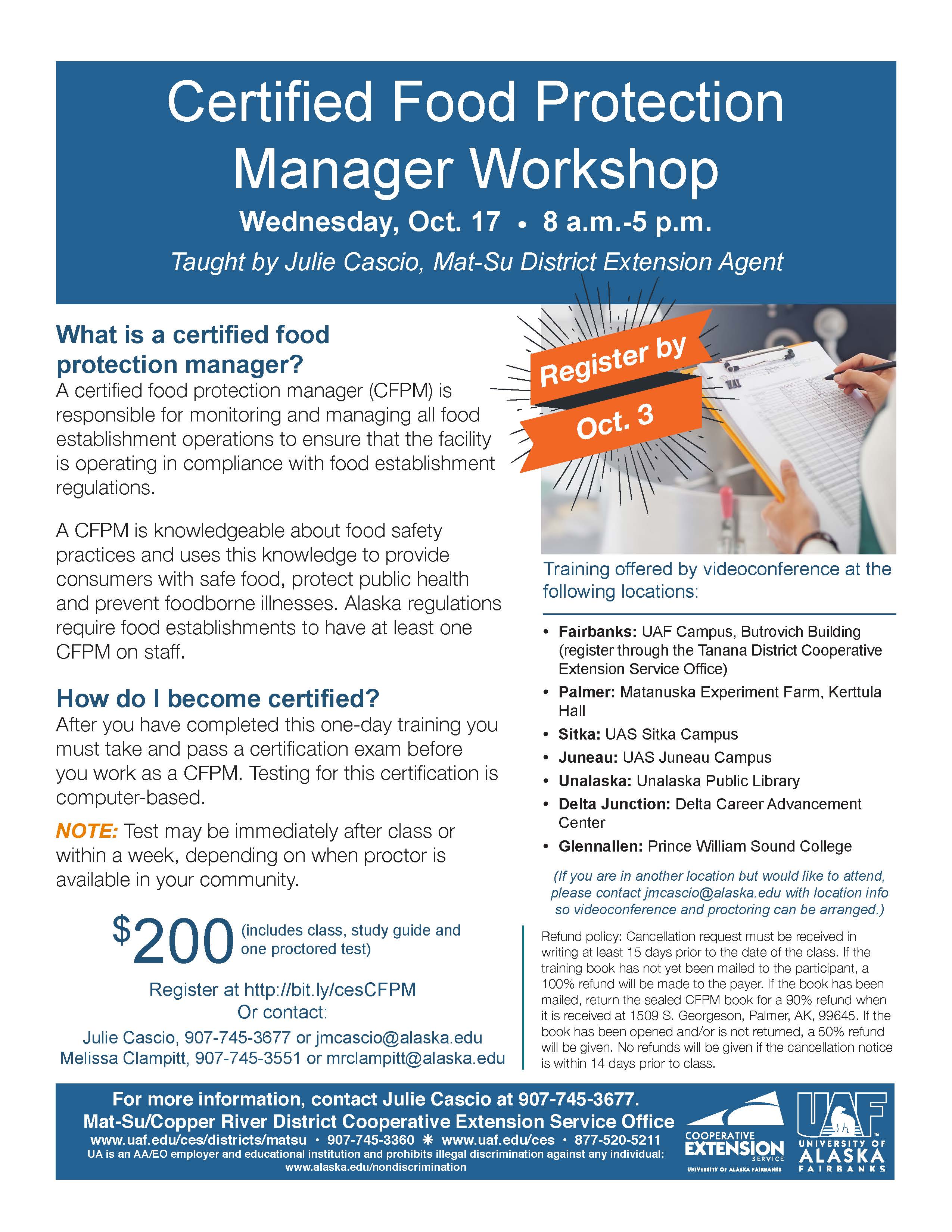 The University of Alaska Fairbanks Cooperative Extension Service will teach a certified food protection manager workshop on Tuesday, April 23. This is a one-day statewide class that will be offered by videoconferencing to Fairbanks, Galena, Glennallen, Haines, Homer, Juneau, Klawock, Palmer, Sitka, Skagway, Soldotna, Talkeetna, Tok, Unalaska, Valdez, and Wrangell, plus other locations that may arrange for the class.