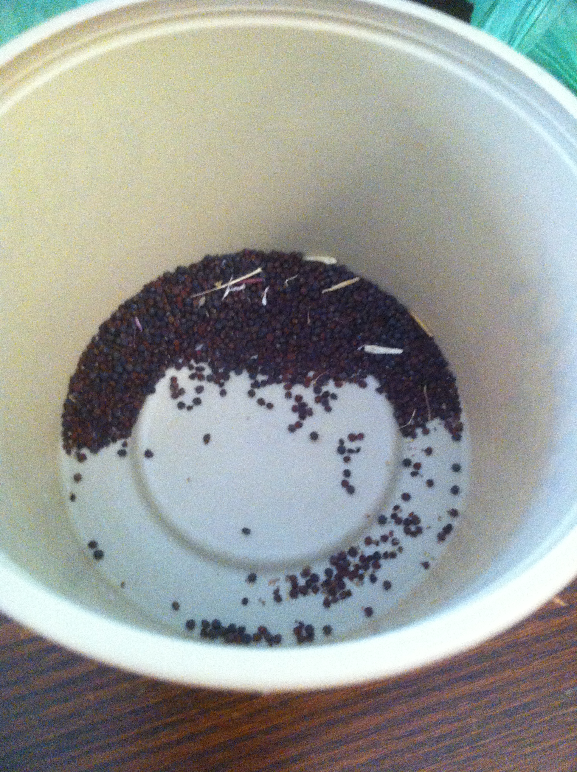 When the seed pods were finally dry enough so you could split them like shelling peanuts, I took the bag down and started collecting the seeds in a plastic margarine tub (see third photo). It can be somewhat tedious work, splitting all the seed pods to get the seeds loose, but it also can be meditative. Once you have all of the seeds separated from the seed pods, you should store them in a cool, dry place until you are ready to germinate them. Hopefully, these kale seeds will sprout next spring.