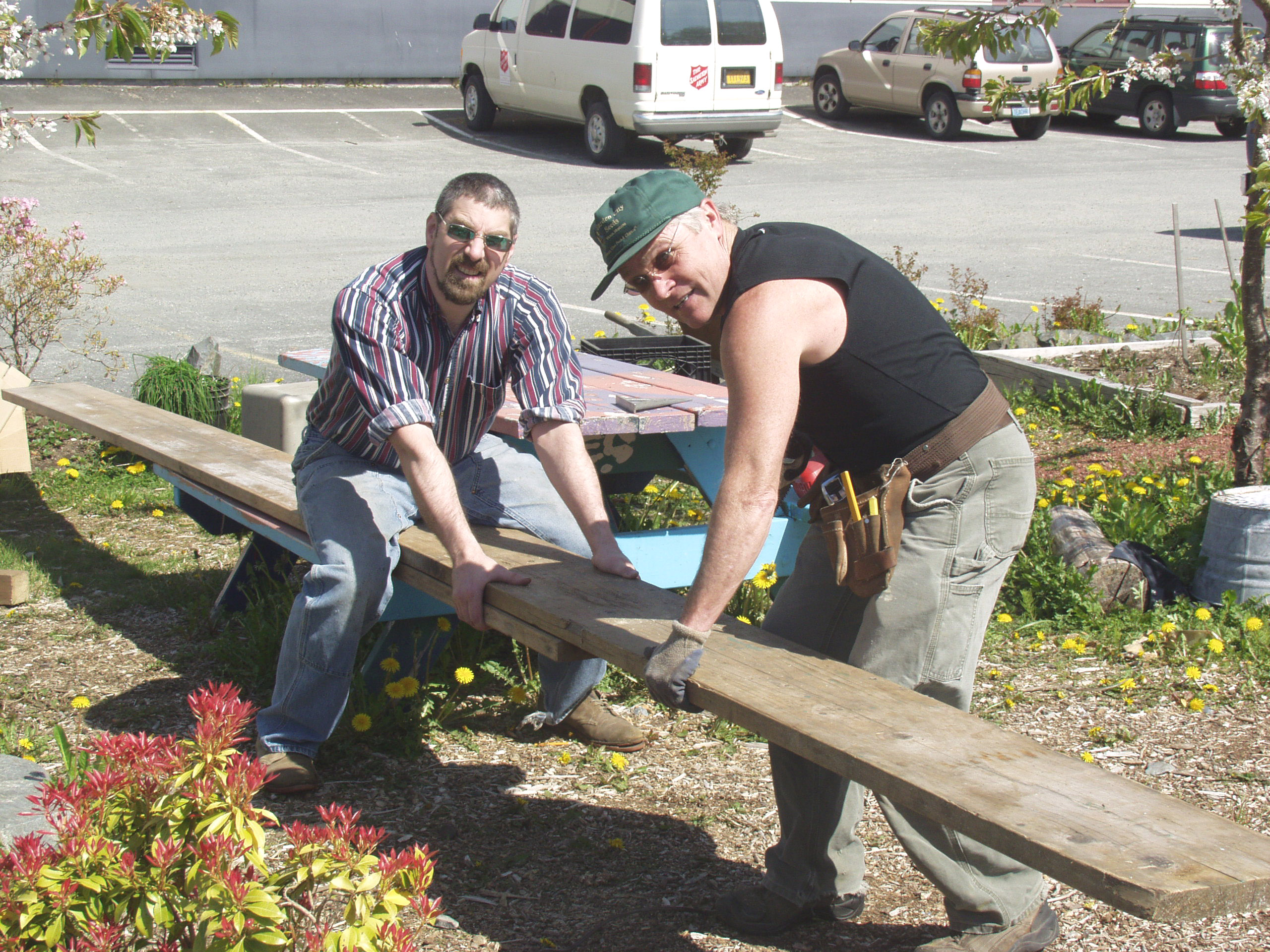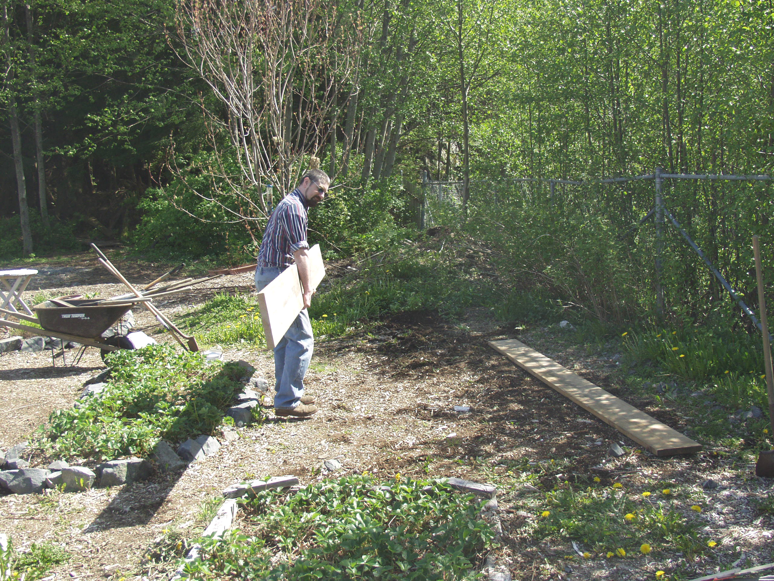 While we’re waiting for spring to finally show up in Sitka, one thing gardeners can do to prepare for planting is build a simple raised garden bed. The pictures with this post feature members of the WISEGUYS men’s health group (Rick DeGroot, Kerry MacLane, Doug Osborne and his daughter, Darby, then 4) building a garden bed in May 2008 at Blatchley Community Garden in Sitka.