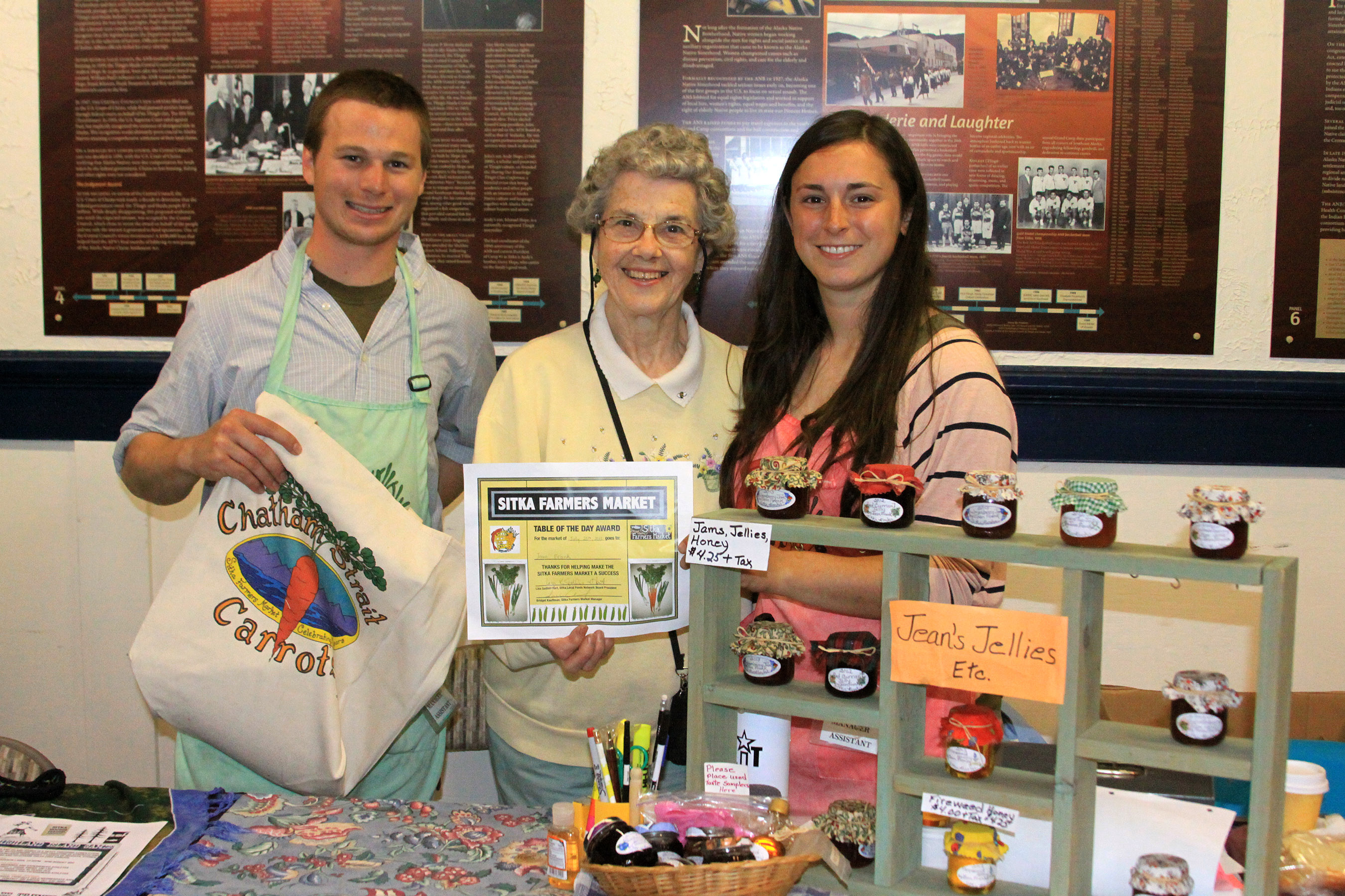 Sitka Farmers Market Interim Manager Garrett Bauer, left, and Co-Manager Francis Wegman-Lawless, right, present the Table Of The Day Award to Peter Apathy and Carole Knuth of Reindeer Redhots at the fourth market of the season on Saturday, Aug. 17, at the Alaska Native Brotherhood Founders Hall in Sitka. Peter and Carole sell Alaska-made reindeer and all-beef hot dogs and Polish sausage, with sauerkraut and chili sides from their cart, which is open at the corner of Lincoln and Lake streets on most big cruise ship days (http://reindeerredhots.com/). They received a gift bag with fresh produce, fresh rhubarb jam and a copy of the Alaska Farmers Market Cookbook. This is the sixth year of Sitka Farmers Markets, hosted by the Sitka Local Foods Network. The next market is from 10 a.m. to 1 p.m. on Saturday, Aug. 31, at the Alaska Native Brotherhood Founders Hall, 235 Katlian St. For more information about the Sitka Farmers Markets and Sitka Local Foods Network, go to http://www.sitkalocalfoodsnetwork.org/.