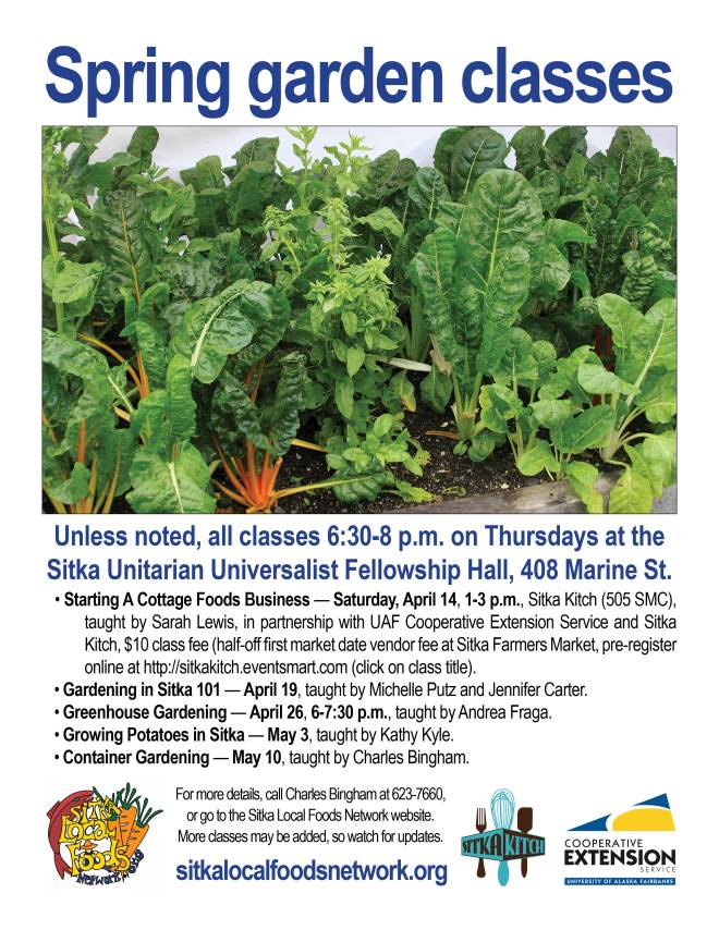 - Starting A Cottage Foods Business — Saturday, April 14, 1-3 p.m., Sitka Kitch (505 SMC), taught by Sarah Lewis, in partnership with UAF Cooperative Extension Service and Sitka Kitch, $10 class fee (half-off first market date vendor fee at Sitka Farmers Market, pre-register online at http://sitkakitch.eventsmart.com (click on class title).