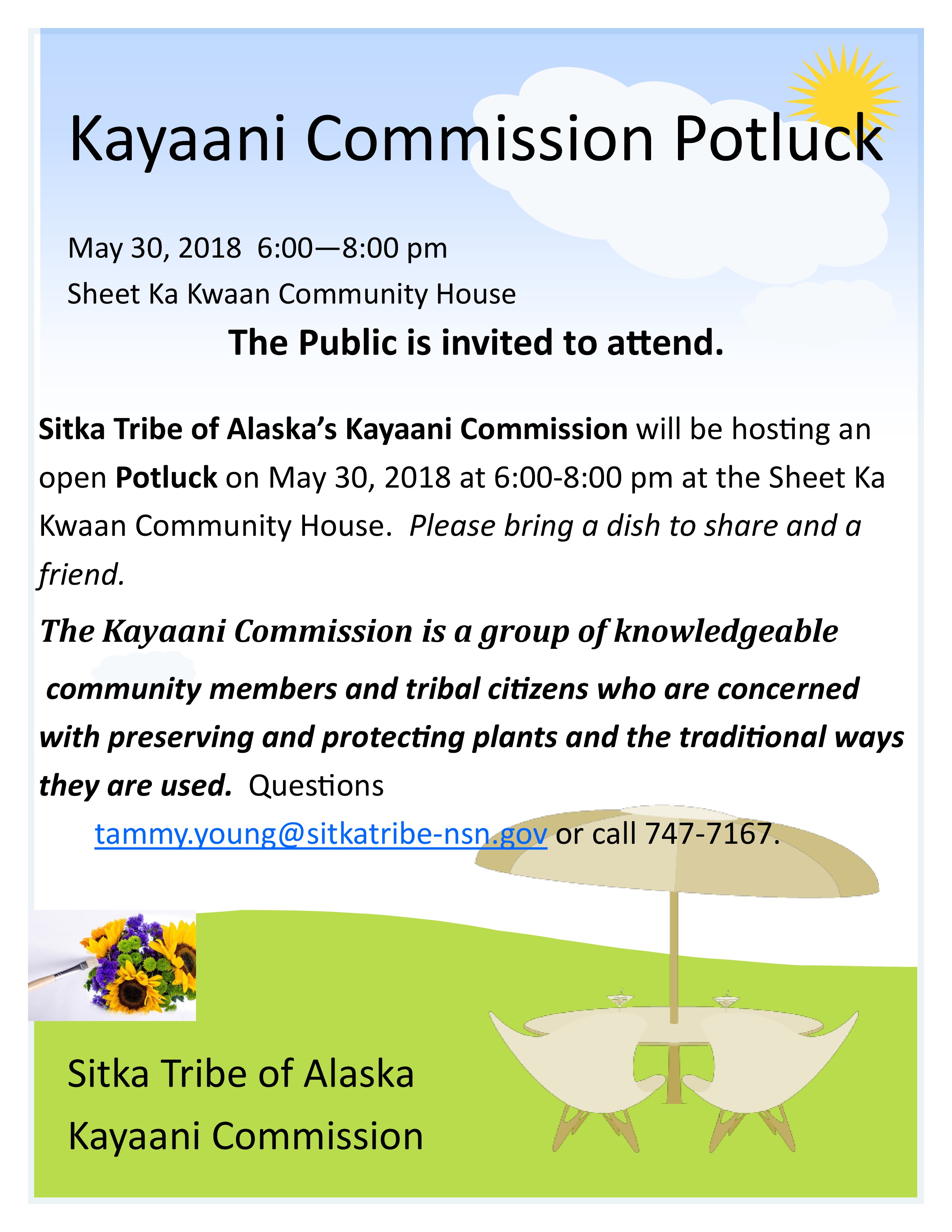 The Kayaaní Commission, which is coordinated by Sitka Tribe of Alaska in partnership with other groups in Sitka, will host an open potluck from 6-8 p.m. on Wednesday, May 30, at the Sheet’ká Kwáan Naa Kahidí community house. The public is invited to attend. Please bring a dish to share and a friend.