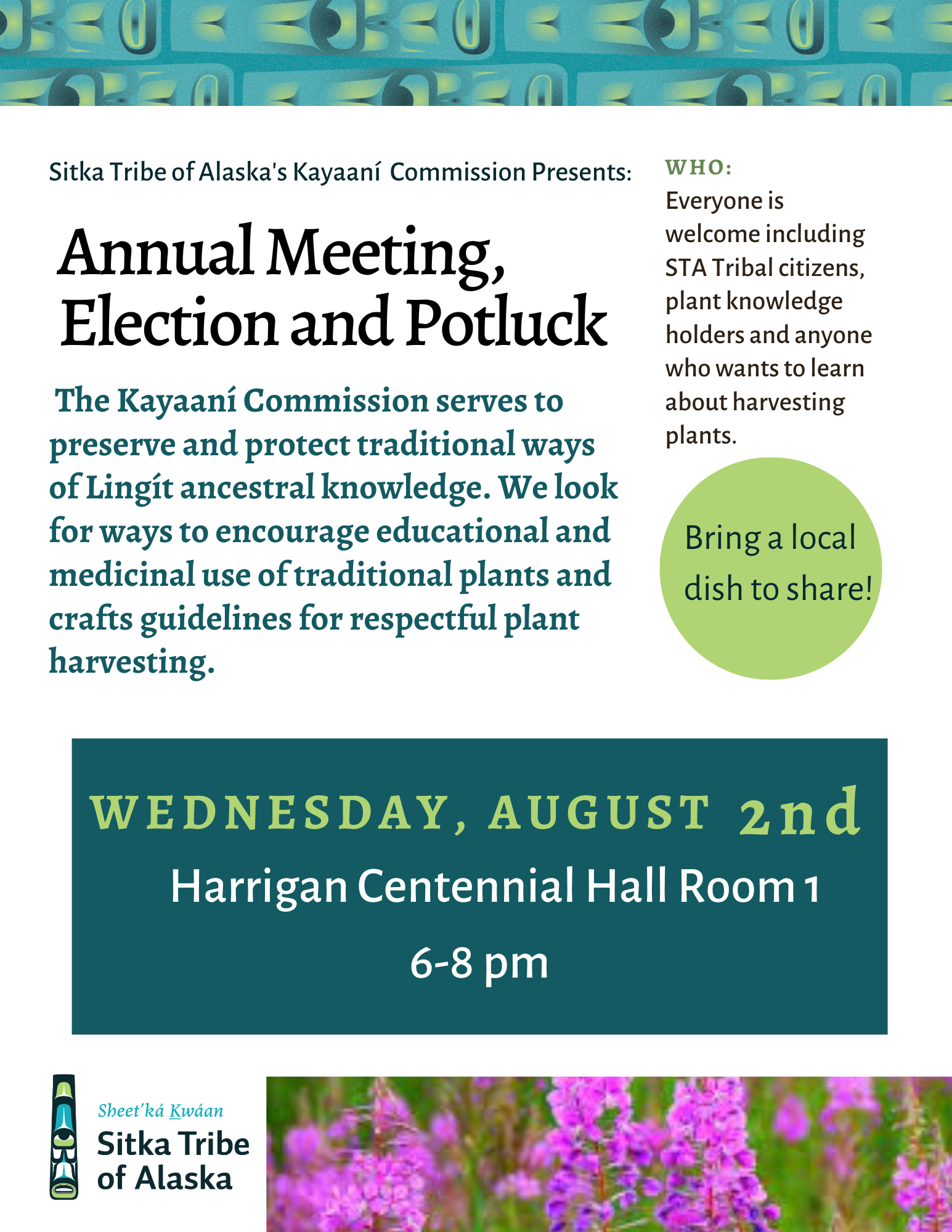 Sitka Tribe of Alaska’s Kayaaní Commission will be holding an open meeting at 6:30 p.m. on Monday, July 31. This will be a hybrid meeting, so you can attend in person at the STA office at 204 Siginaka Way or via Zoom. The public is invited to attend.