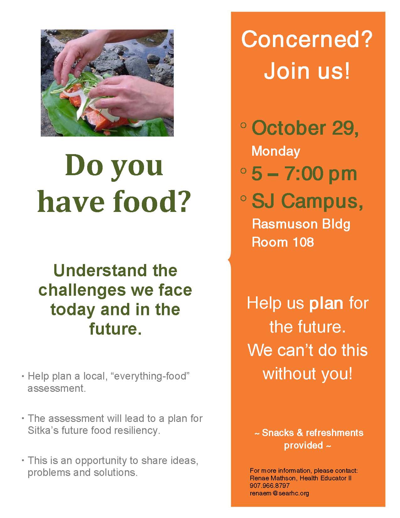 For more information, contact Renae Mathson at 966-8797 or renae.mathson@searhc.org, or contact Andrianna Natsoulas at 747-3477 or anatsoulas@thealaskatrust.org. Sitka residents can ask to join the Google Groups e-mail list for the project to keep up to date with what’s happening.