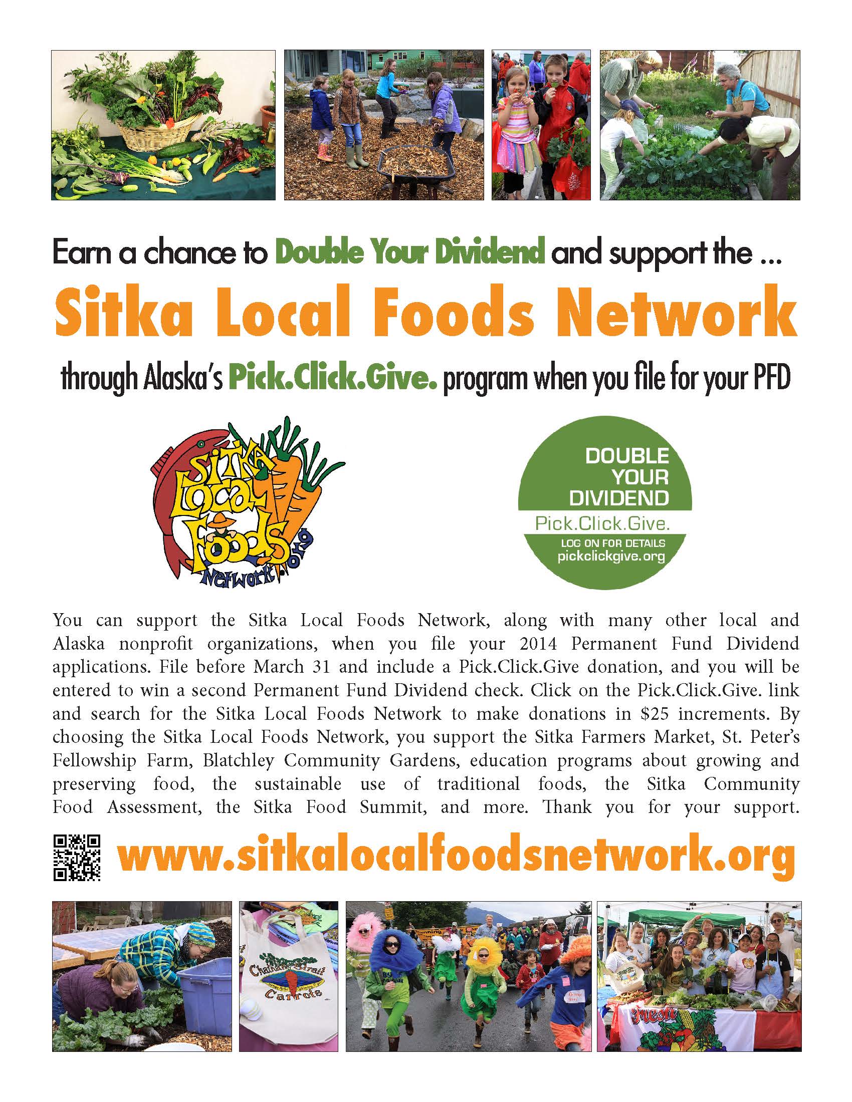 This is the second year the Sitka Local Foods Network will participate in the Pick.Click.Give. program, which allows people to donate in $25 increments to their favorite statewide and local 501(c)(3) nonprofit organizations when they file their PFD applications from Jan. 1 through March 31. We thank the 56 donors who pledged $2,900 to the Sitka Local Foods Network in 2014, and we appreciate your support again in 2015.