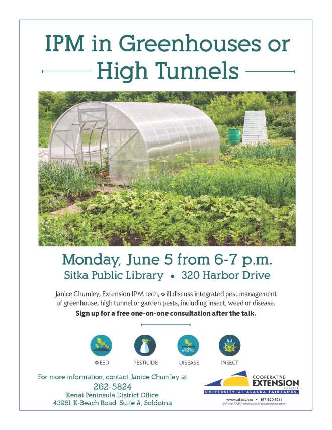 Janice Chumley, who is the integrated pest management tech for the University of Alaska Fairbanks Cooperative Extension Service, will be in Sitka on Monday and Tuesday, June 5-6, for one-on-one consultations with local gardeners/farmers. She also will give a presentation about integrated pest management in greenhouses and high tunnels from 6-7 p.m. on Monday, June 5, at the Sitka Public Library (note, this is a location change from what was announced in April).
