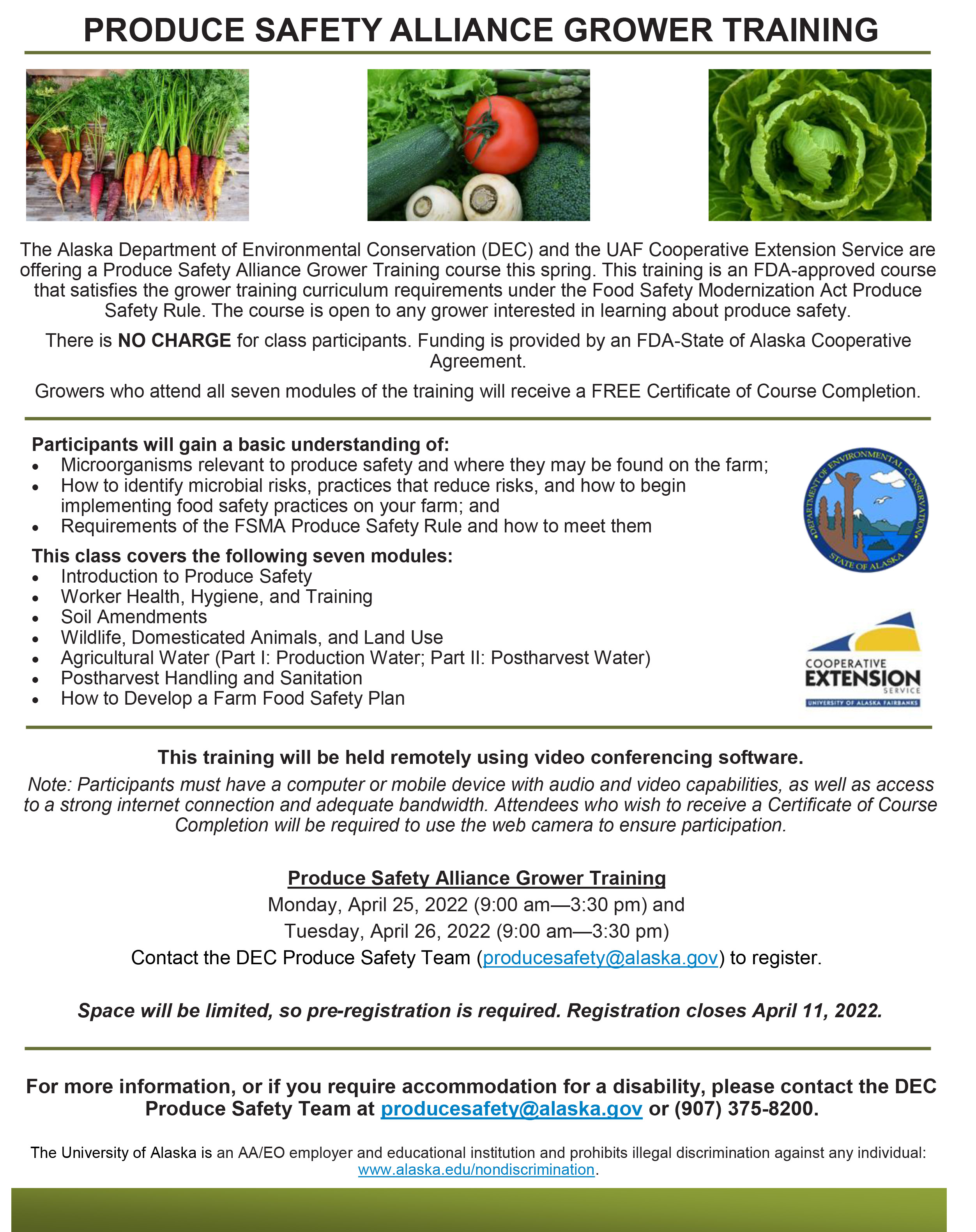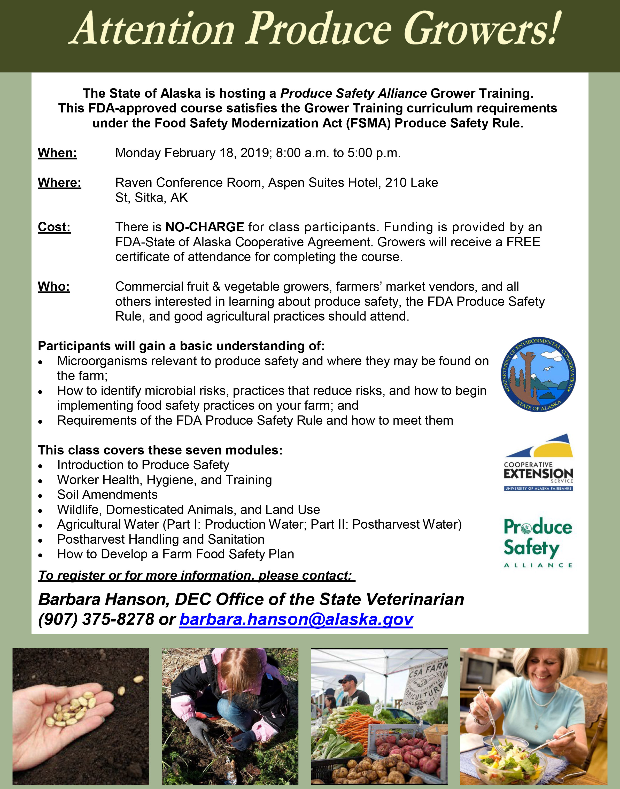 In conjunction with the Alaska Food Festival and Conference, two other events will take place in Homer during this week. There will be a Produce Safety Alliance Grower Training on Thursday, March 7, to teach commercial food growers how to meet the requirements of the new Food Safety Modernization Act Produce Safety Rule. On Sunday, March 10, the Alaska Farmers Market Association will host its annual meeting and planning session.