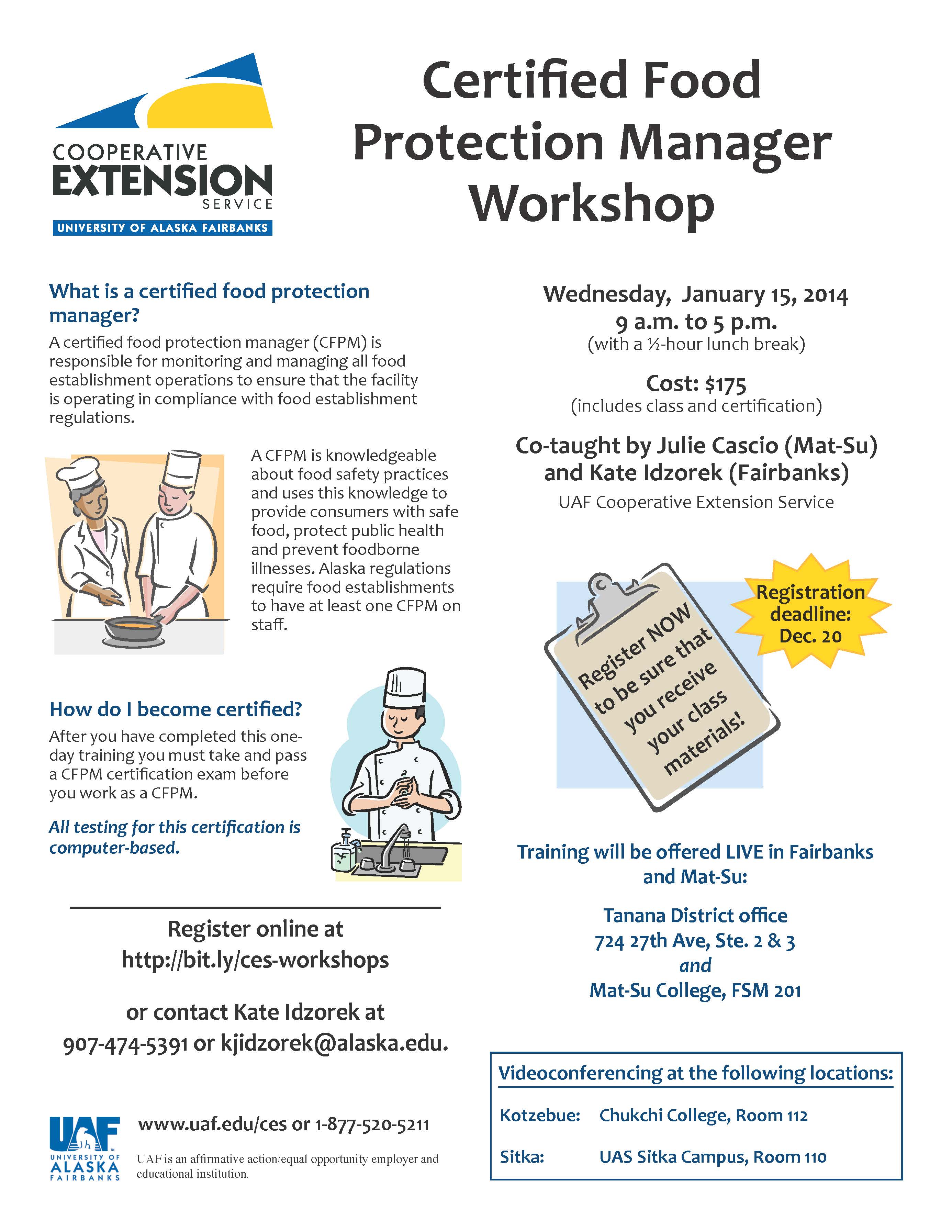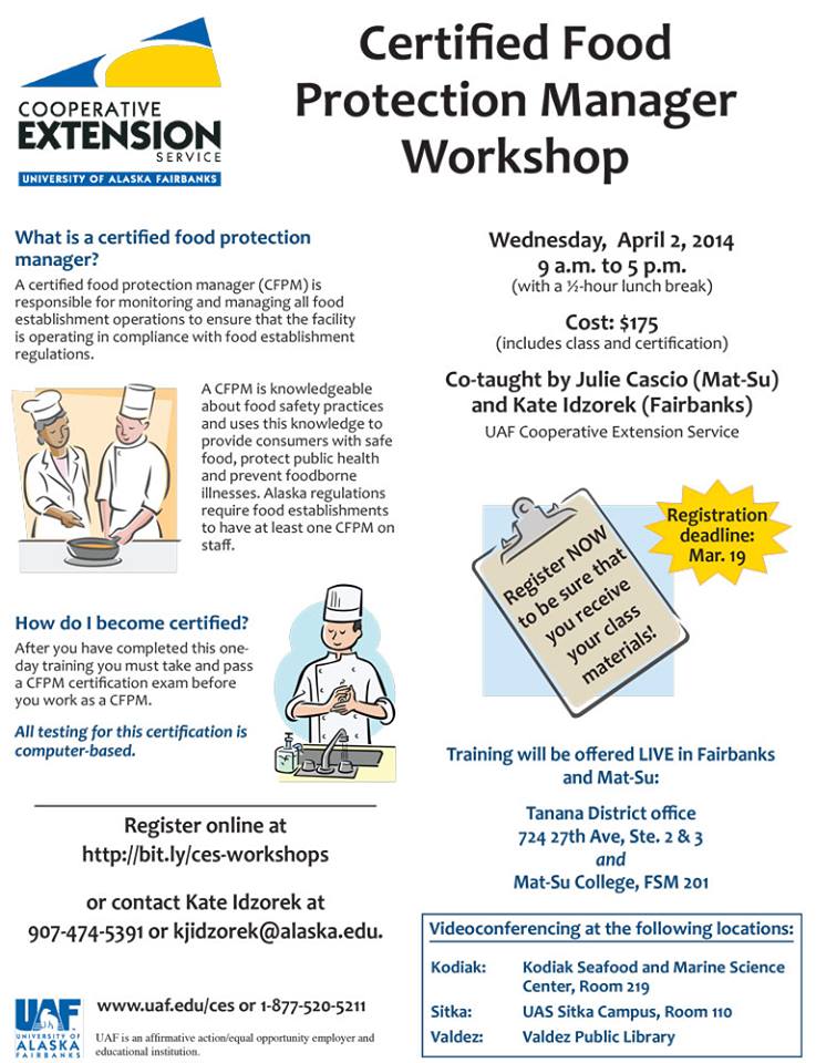 Wednesday, March 19, is the registration deadline for a certified food protection manager workshop being taught on Wednesday, April 2, by University of Alaska Fairbanks Cooperative Extension Service. This is an all-day statewide class that will be offered live in Fairbanks and Palmer, and by videoconferencing to Sitka, Kodiak and Valdez.