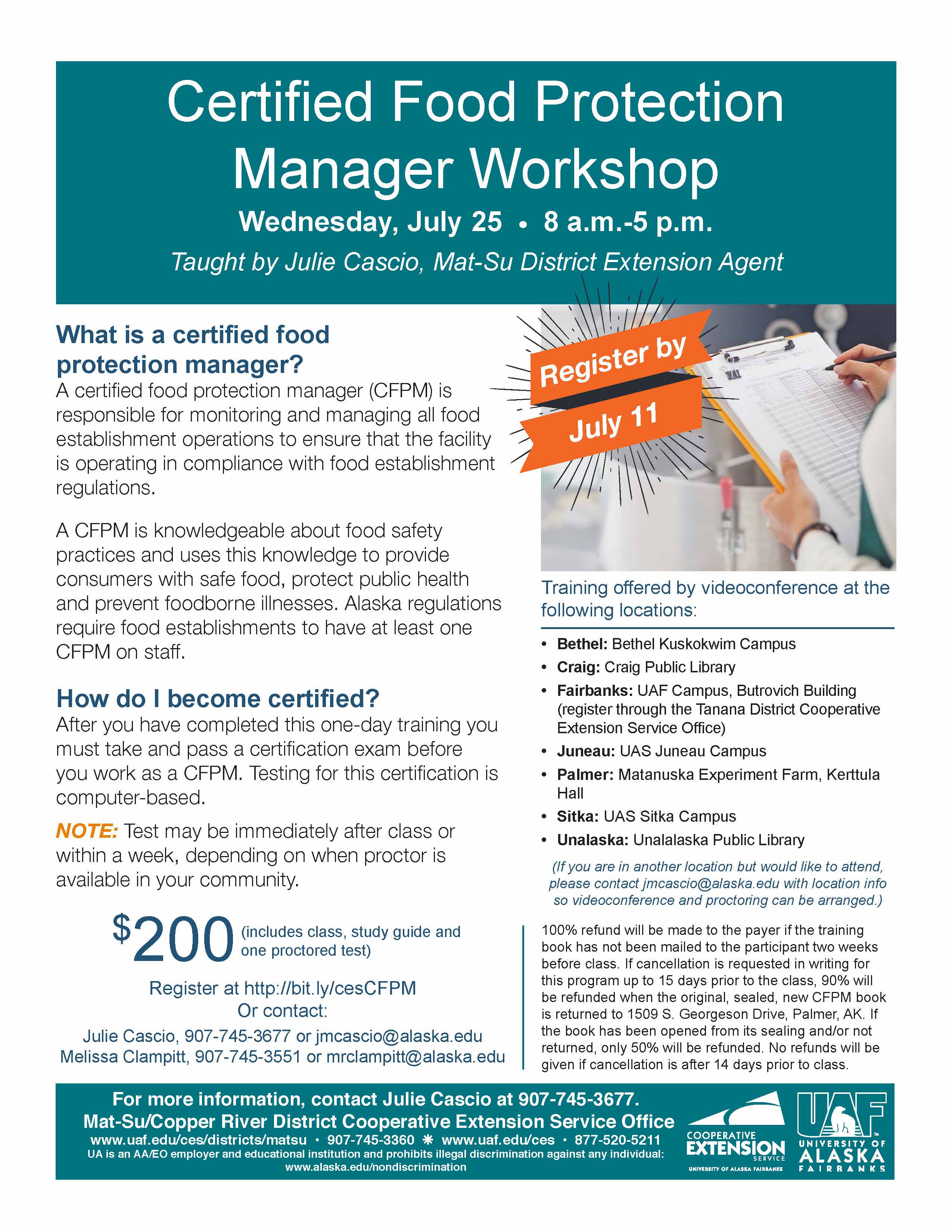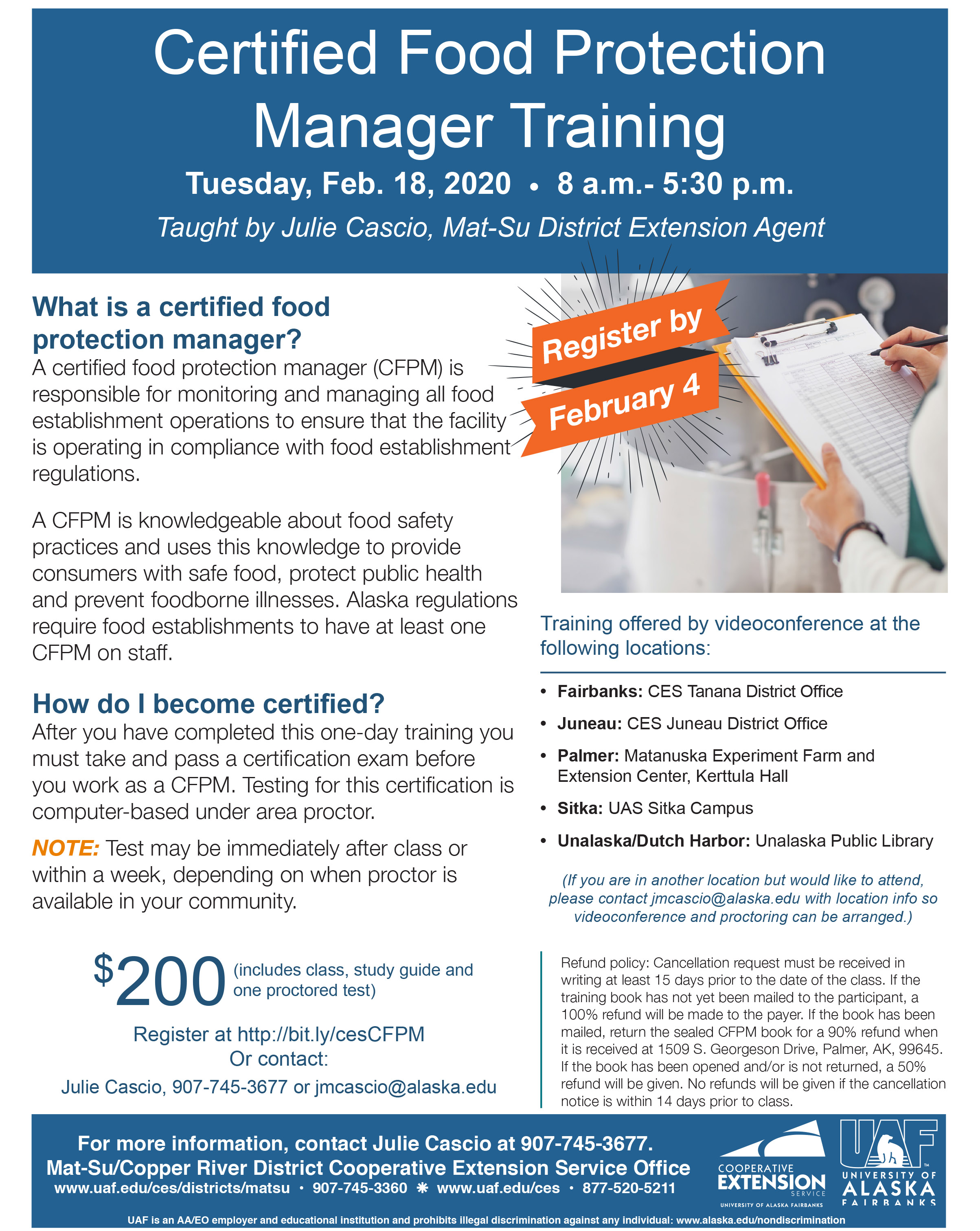 The University of Alaska Fairbanks Cooperative Extension Service will teach a certified food protection manager workshop on Monday, March 8. This is an all-day statewide class that will be offered by videoconferencing to Fairbanks, Palmer, Juneau, Glennallen, Valdez, and Sitka, plus other locations that may arrange for the class.