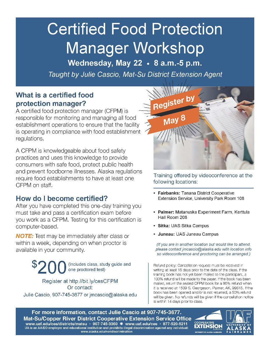 A CFPM is knowledgeable about food safety practices and uses this knowledge to provide consumers with safe food, protect public health and prevent food-borne illnesses. Alaska regulations require food establishments to have at least one CFPM on staff.